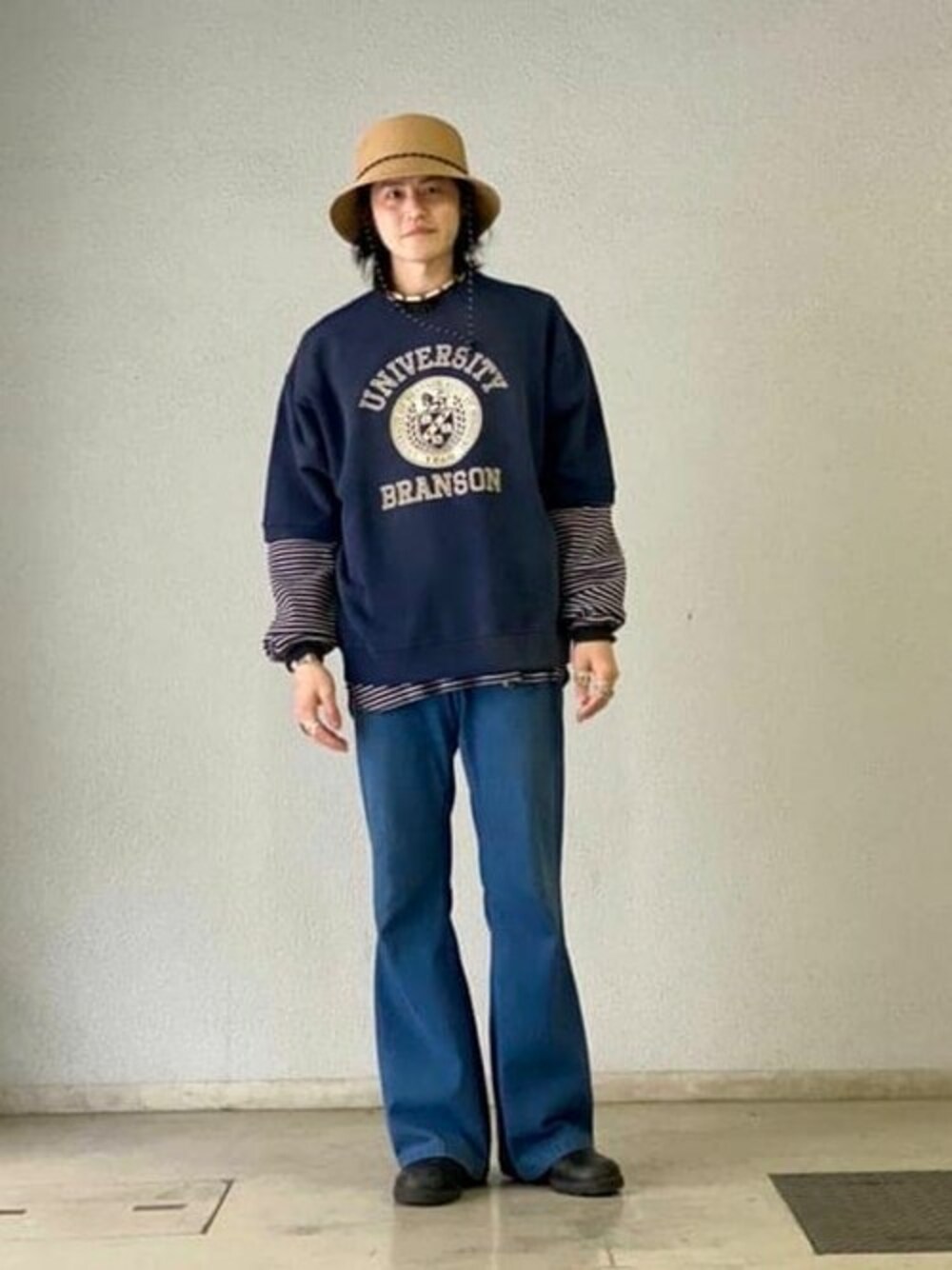 半袖トレーナーのインナーにボーダーサーマルを合わせました。長袖のTシャツを着ても、半袖トレーナーだけでも良さそうです。 BEAMS MEN 渋谷 / 東 賢人