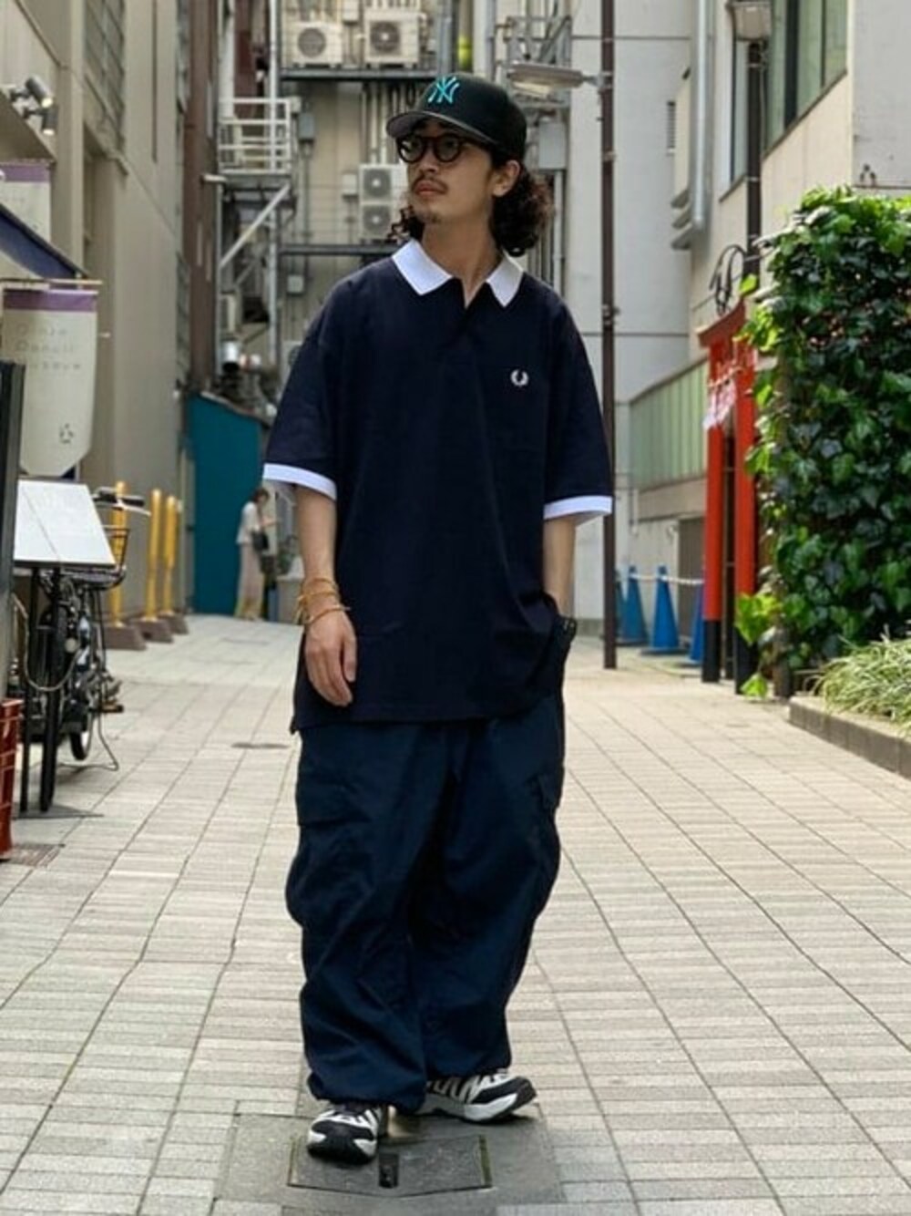 大好きなネイビーをワントーンでコーディネート。上下は異素材を合わせて、メリハリが出るように意識しました。濃い色のポロシャツは無条件に上品な印象が漂いますね。 BEAMS 銀座 / 中川 裕希