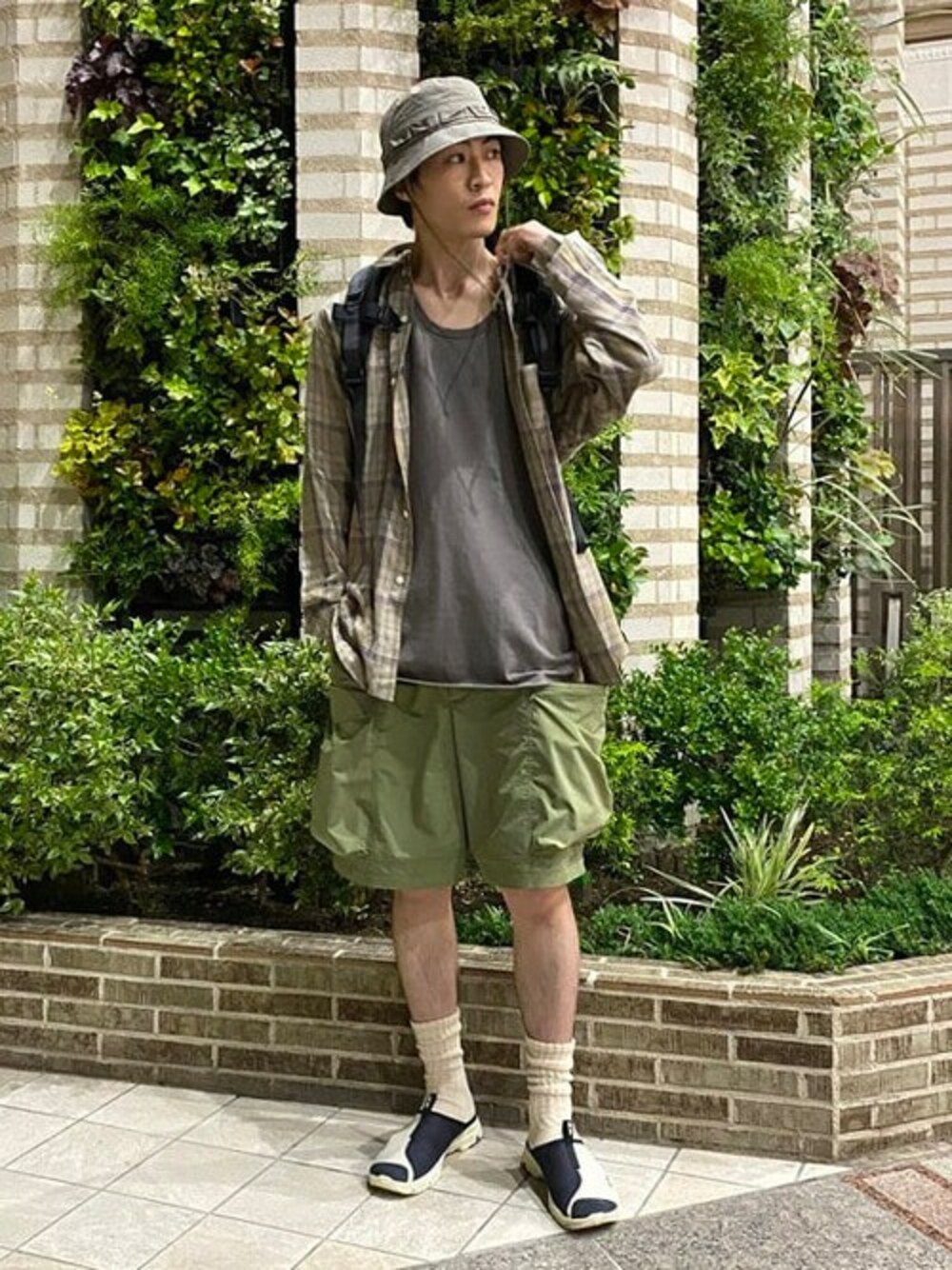 アドベンチャー(アウトドア)スタイルでございます。<SALOMON>の『RX Slide 3.0』から全体のカラーリングを考えました。一見分かりにくいのですがヒールにパープルが入っているので、色合わせ&差し色で<GREGORY × BEAMS BOY>別注のバックパックを背負いました。グレーとベージュでまとめた上半身に、<NULL>の奇天烈ショーツが上手くマッチしたナイスカラーコーデと自負しております。 BEAMS 池袋 / 平柳 楓馬