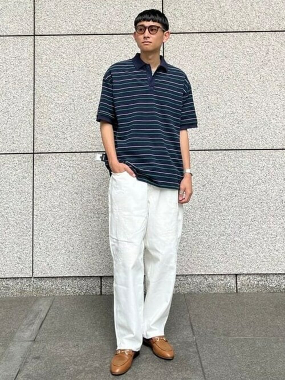 リバーシブルで着用できるビッグポロシャツ。 肩が落ちるシルエットなので、ストリートっぽい合わせがオススメです! パンツは〈 NULL TOKYO × BEAMS 〉の別注デニムで合わせました。ダメージ加工が施されている他、股に隠しベンチレーションがあり、通気性も抜群です◎ 足元はカジュアルになり過ぎないように、ブラウンのビット付きのミュールで☺︎ BEAMS 新丸の内 / ハラダヒロツグ
