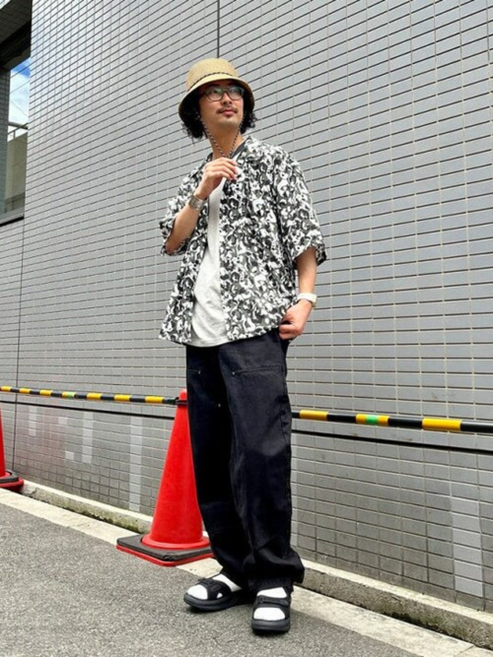【夏のBLACK】黒を基調にしたコーディネート!柄シャツとサンダルで季節感を出し、上品なワークパンツでアクセントをつけました! BEAMS ストリート梅田 / BAKU