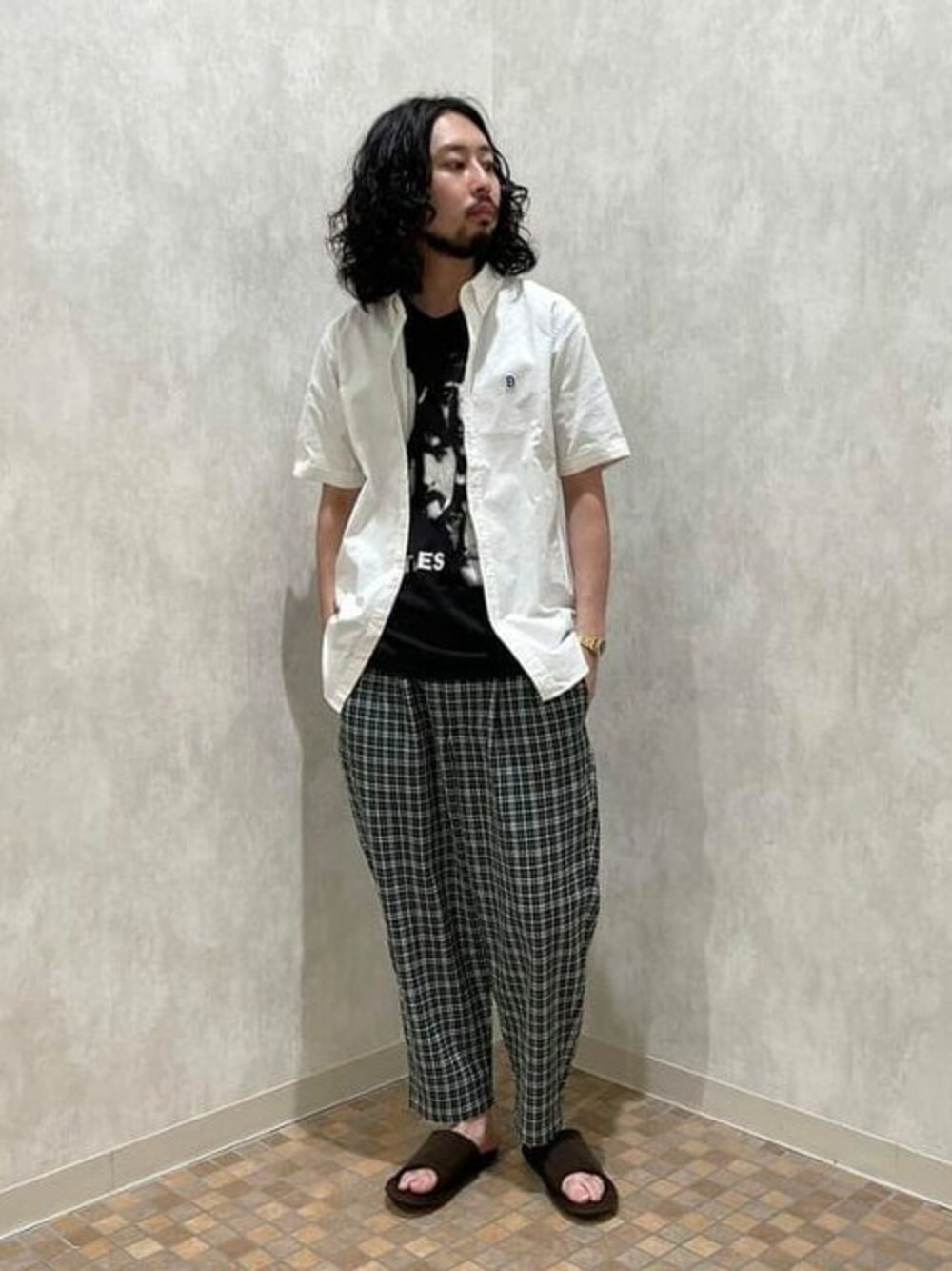 【王道のボタンダウンシャツ】 アメカジに欠かせないボタンダウンシャツ。オックスフォードの半袖はこれからのシーズン重宝すること間違いなし!シンプルな分チェックパンツで変化を付けたスタイリングです!! BEAMS 池袋 / 天池 隆佑