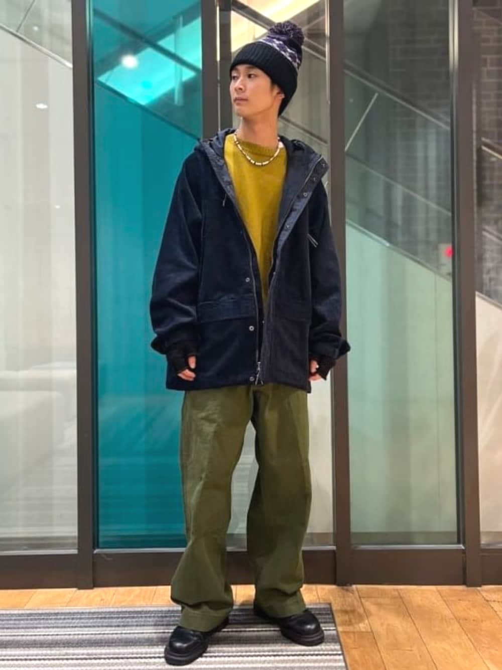 ネイビーとイエロー、カーキとイエロー、ネイビーとカーキ、好きな色の組み合わせでスタイリングを組みました!アーガイル柄のボンボンがついたワッチキャップかわいいです。 BEAMS みなとみらい / ジン