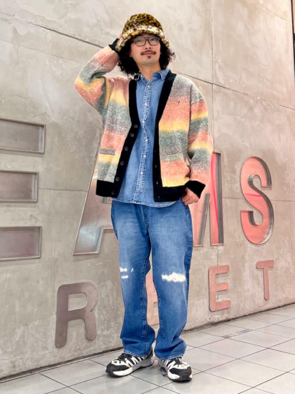 【ファンシー】〈Patta〉のグラデーションカーディガンと〈GRILLO〉のレオパードハットを合わせた柄柄スタイリングです!なので、その他はデニムで統一させました!こういうスタイリングが個人的には元気でるんですよね〜笑 ビームス ストリート 梅田 / BAKU