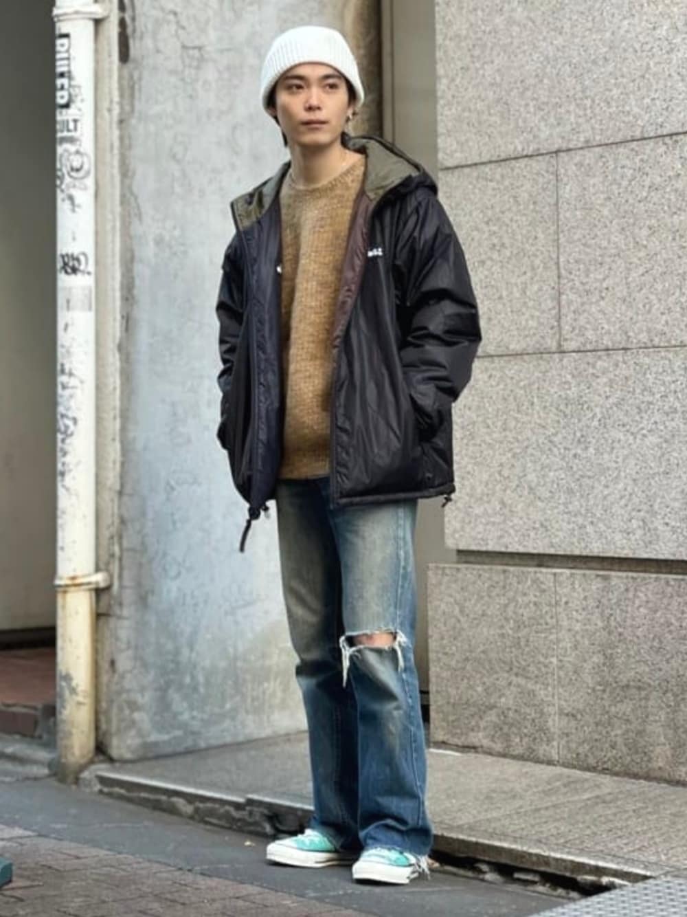 〈WILD THINGS × BEAMS〉別注Quilted Parkaを着用。リバーシブルでお楽しみいただけます。〈BEAMS〉オリジナルのシャギーニットをインナーに持ってきました。こちらのニットは見た目よりも軽量で暖かく、一枚で様になるデザインとサイズ感。こういうニットを一着持っていると重宝しますよね! BEAMS 銀座 / 鈴木 健斗