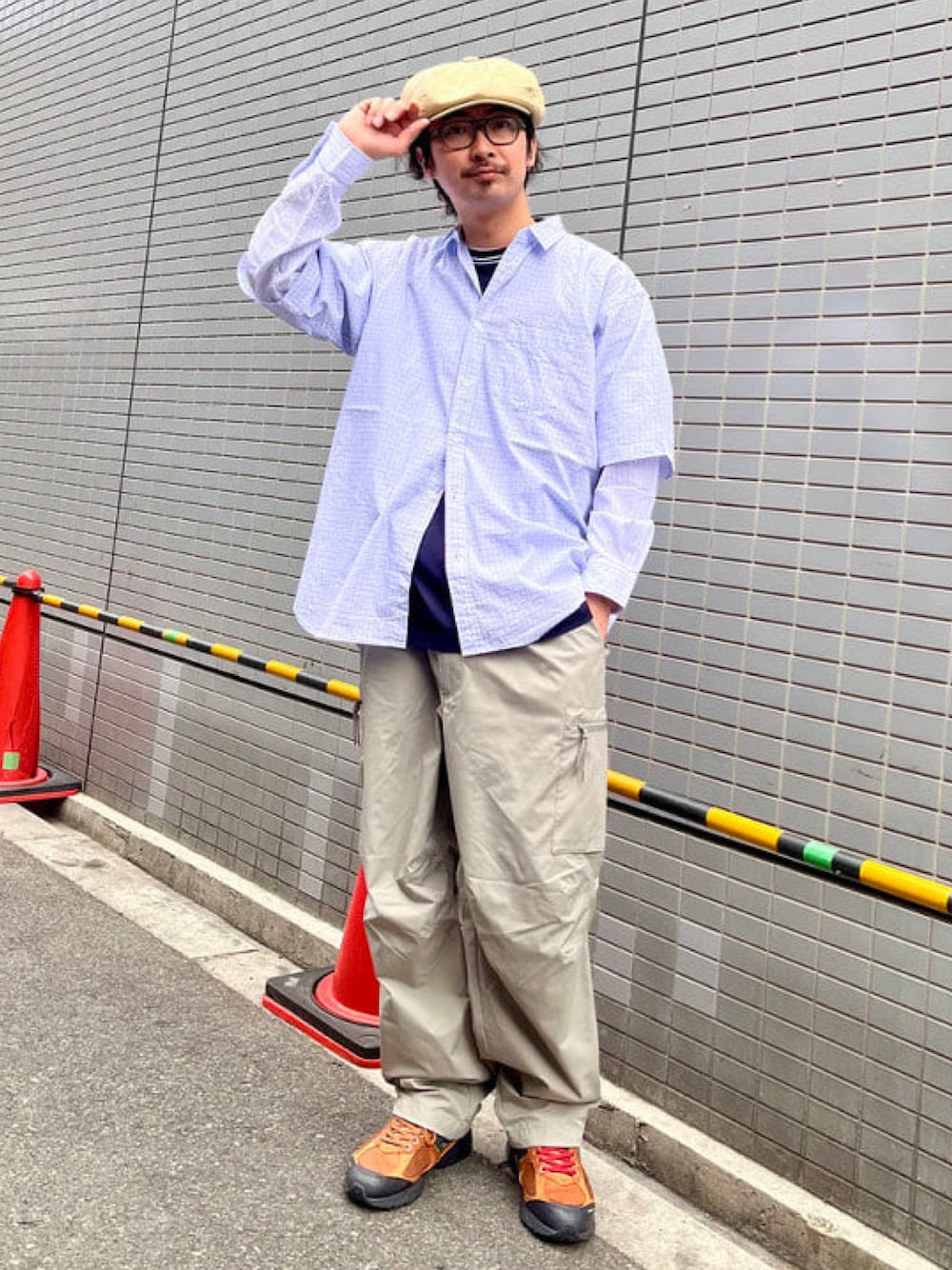 【春らしくサラッと】一見シンプルなスタイリングですが、シャツはレイヤード風のデザイン。パンツは今トレンディな"テックアイテム"を着用!シューズもアウトドアテイストの強い〈NEW BALANCE〉で決まりです!僕は185cm73kgです! BEAMS / BAKU