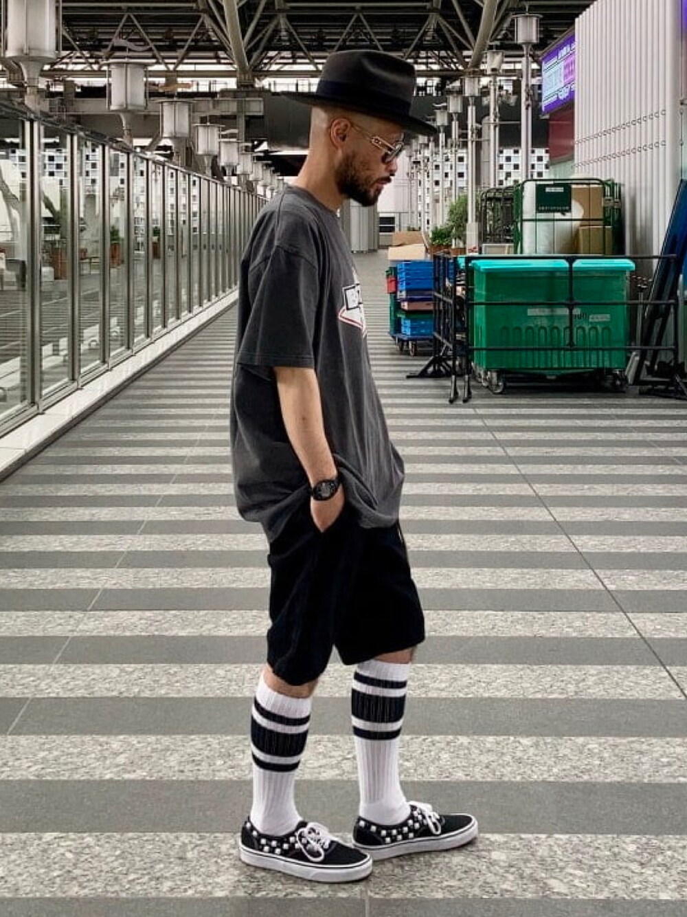 【Street style sample】ヒップホップTシャツを軸に現代的なニュアンス表現としてブラックカラーで纏めつつ、ショーツとトリップスターのロングソックスをコーディネート♪ロングソックスとVANSの白がやや勝った流れが個人的に好きです(°▽°) 〈*165cm / 53〜55kgで Tシャツは3のサイズ、ショーツは少し丈が欲しくてMサイズへアップ♪〉 ビームス 梅田 / 大場 義弘