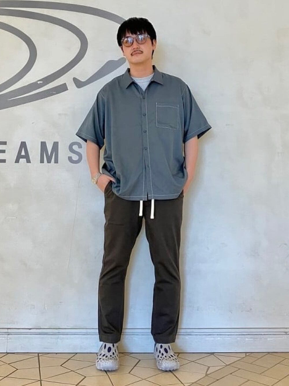 【グレートーンでスッキリスタイリング】定番アンクル丈のチノパンツは程よくテッキーな素材感のシャツと合わせるとスタイリッシュに見えますよね。ウエストコードはあえて出して、サンダルもテクニカルなタイプを合わせてアクセントに。レザーサンダルやローファーで大人っぽくするのもアリ。是非参考にしてみてくださいね。 BEAMS / Noza