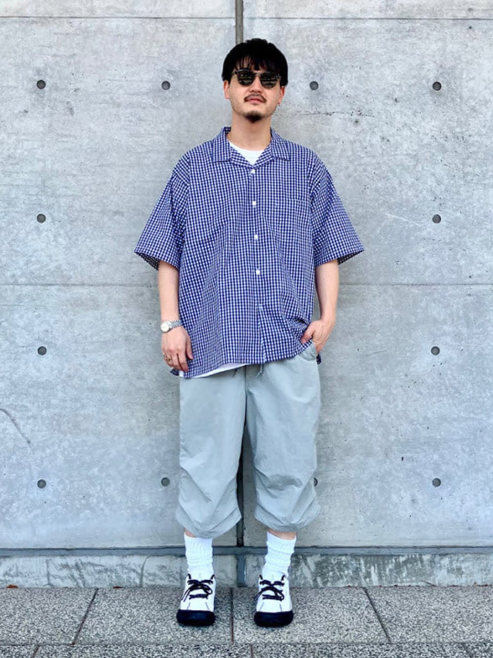 クリーン×テクニカルでスタイリング。 無機質なセメントカラーがイケてる<BEAMS>ナイロン7分丈パンツ、気分ですよね。爽やかな<BEAMS>ギンガムチェックシャツはスラックス合わせでもイケるので是非1着!お買い得なタイミングにどうぞ。 BEAMS / Noza