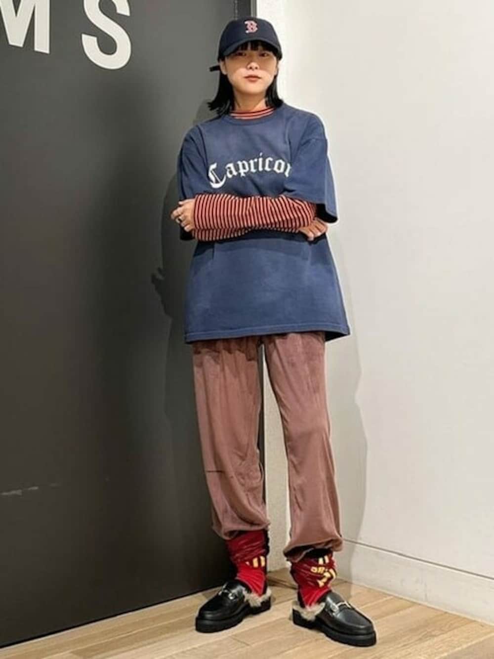 【レイヤードスタイル】BEAMSのスーベニアTシャツは163cmでSサイズ、VAPORIZEのロングスリーブはMサイズ着用です。Tシャツはそれぞれ星座の名前が落とし込まれており、Capricornはやぎ座を意味します。古着のような風合いもGOOD! BEAMS / OD