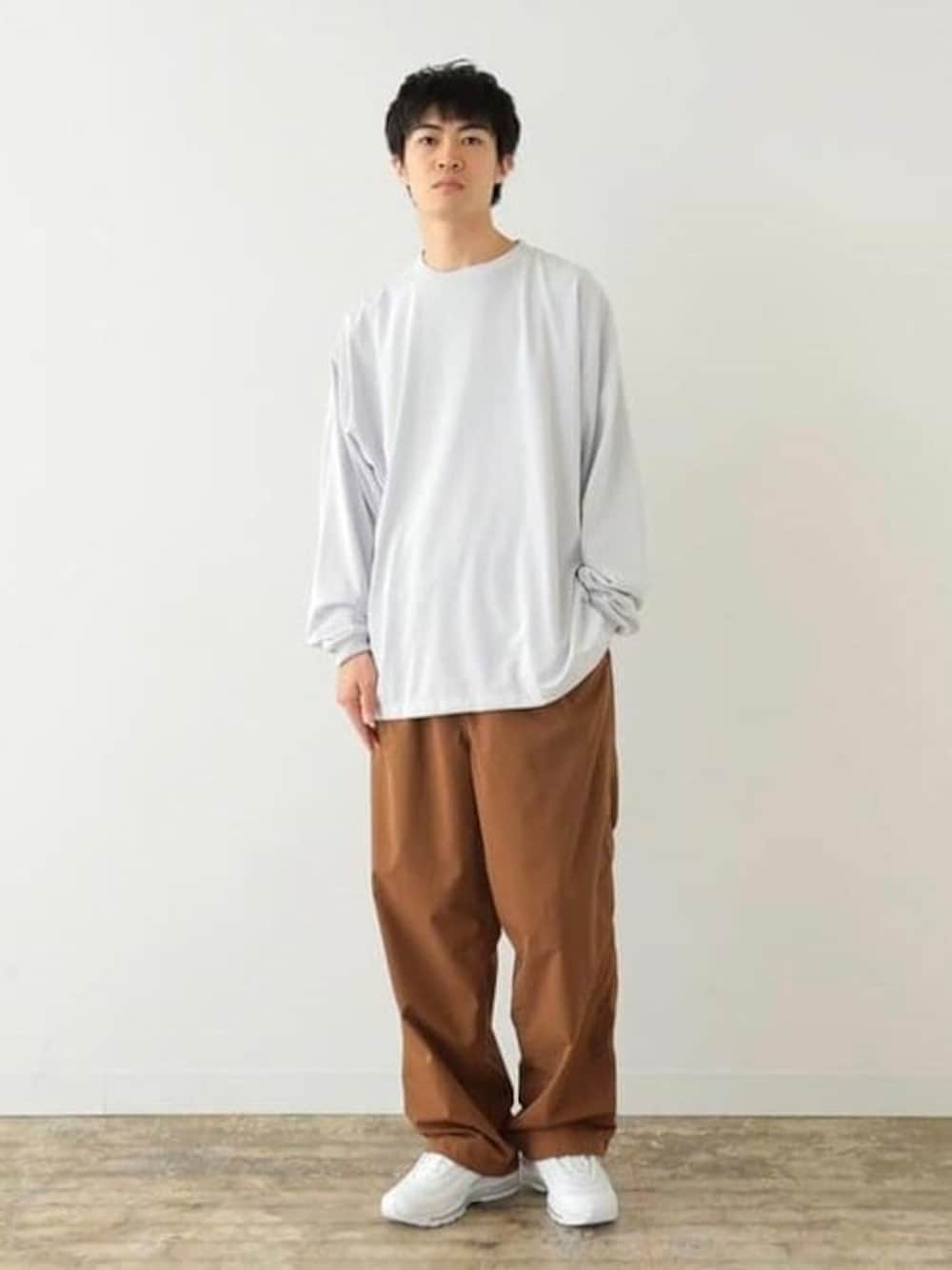 【テックなロンTとイージーパンツ】 スポーティな雰囲気があるロングスリーブTシャツ とパンツを合わせたテック系スタイリング。どちらもポリエステル100%ですが、Tシャツはコットンライクな肌触りで、パンツはドライタッチなストレッチ素材。ドローコードを絞って立体感を出すのがポイントかと。 BEAMS / 平柳 楓馬