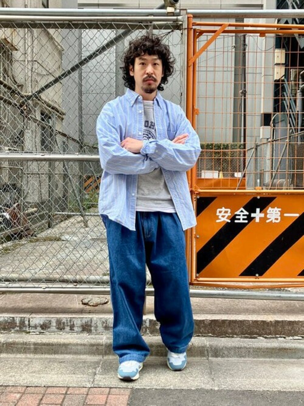 春の寒色系アメカジコーディネート。最近上下ルーズに着るスタイルより上ジャスト、下ルーズなシルエットが人気ですが自分は昔から上下ルーズなサイズが好きです。 BEAMS / 冷水友紀