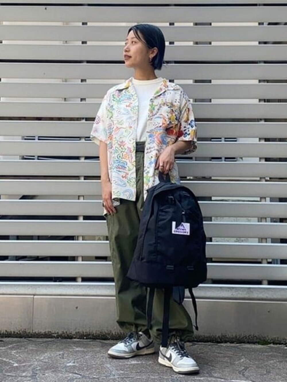 毎年今年はどんな柄かな〜と個人的に楽しみにしているのが<SUN SURF>のアロハシャツです。今回はメンズで展開しているホワイトベースのクレイジー柄がズキュンとキてしまいました!柄に個性がある分、白Tとミリタリーパンツでシンプルな合わせに。157cmの岡本はメンズサイズのMサイズを着用しておりまして、女性でもゆるっとしたサイズ感が好きな方には大変オススメです〜。 BEAMS 北千住 / オカモト ミサキ