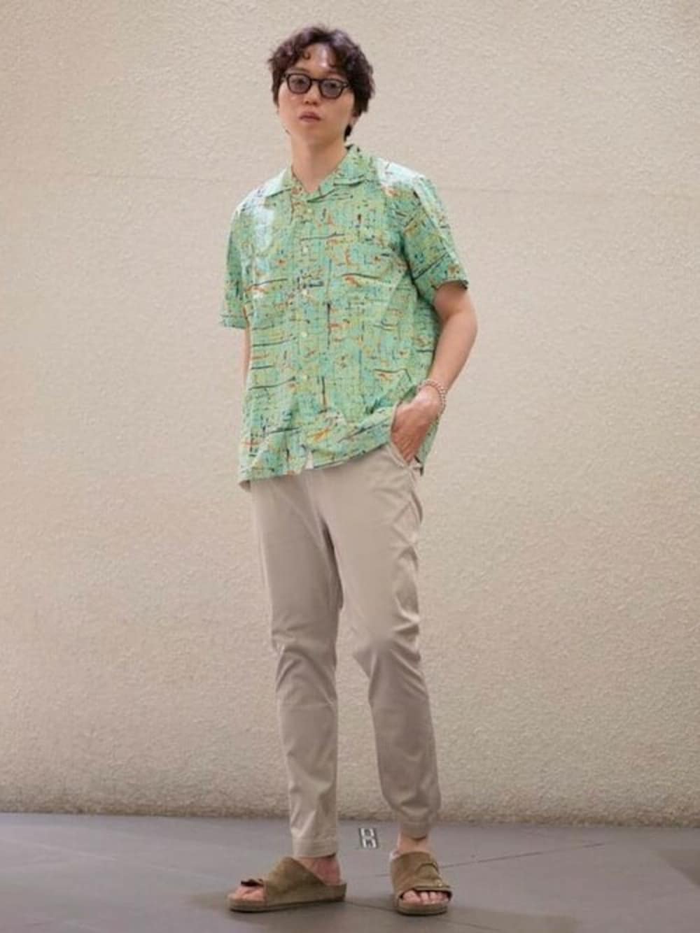 【アーバンリゾートスタイル!】手書き風のペイントが雰囲気抜群な〈BEAMS PLUS〉オリジナルのオープンカラーシャツに〈BEAMS〉オリジナルのピケストレッチテーパードパンツを合わせた都会的なリゾートスタイル!あえて上下Lサイズで縦のラインを強調させました! BEAMS 新宿 / SUDO
