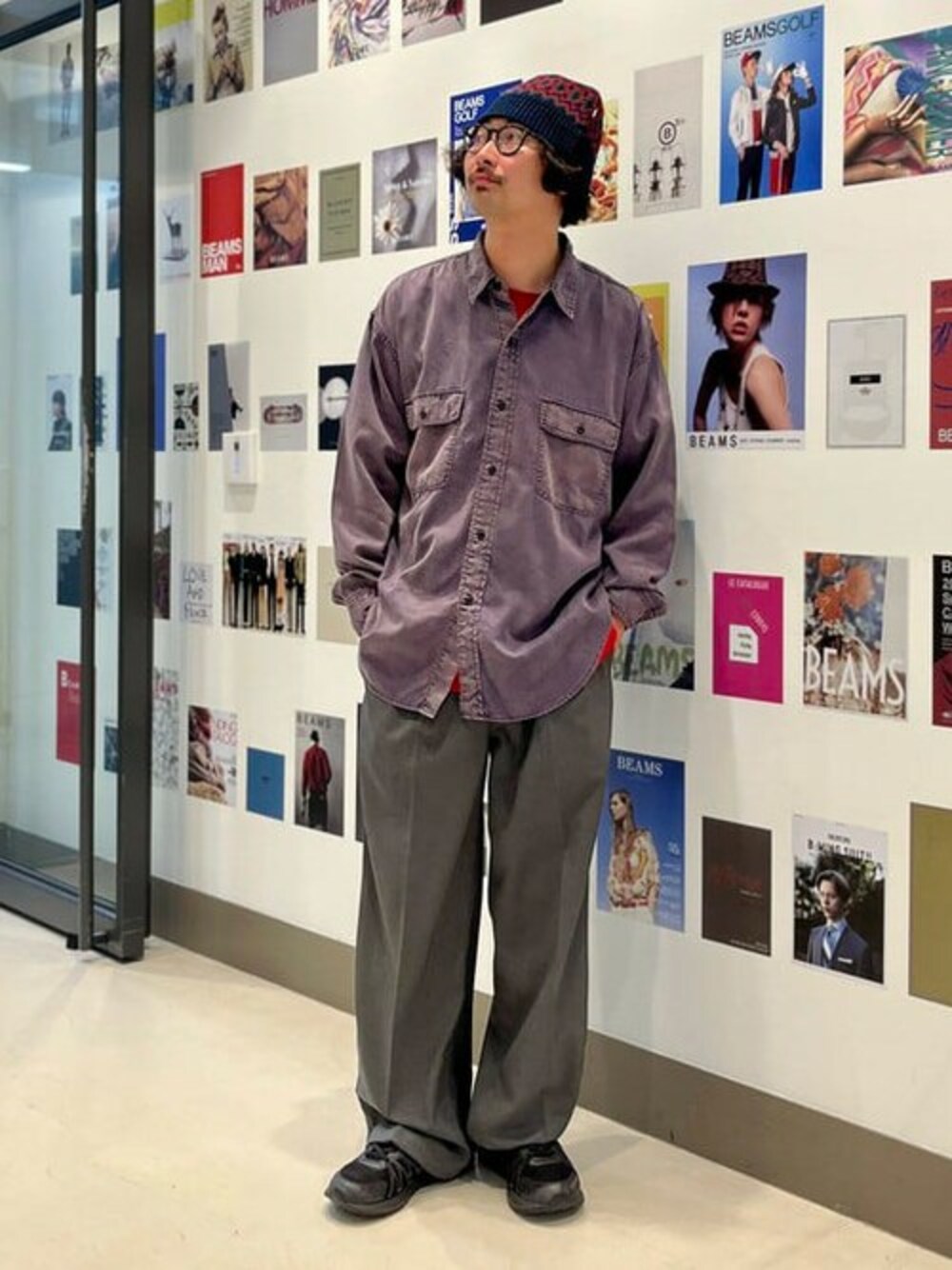 予約アイテム着用『秋はサラッとしたSTYLE』上下共にオチ感が綺麗なアイテムでクリーンな印象もあるのですが、加工のシャツなので上手くバランスをとりました。ちょっと無地アイテムだけと寂しいので自分らしいハットを着用しました!僕は185cm75kgです! BEAMS ストリート梅田 / BAKU(東江 漠)