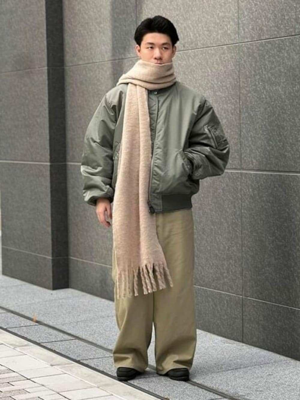 今回はMA-1をメインにコーディネートを組んでみました。男臭いというよりかは、少し綺麗目なスタイルに。かなりボリュームのあるマフラーでアクセントを付けたコーディネートです! BEAMS 神戸 / 石立 温暉