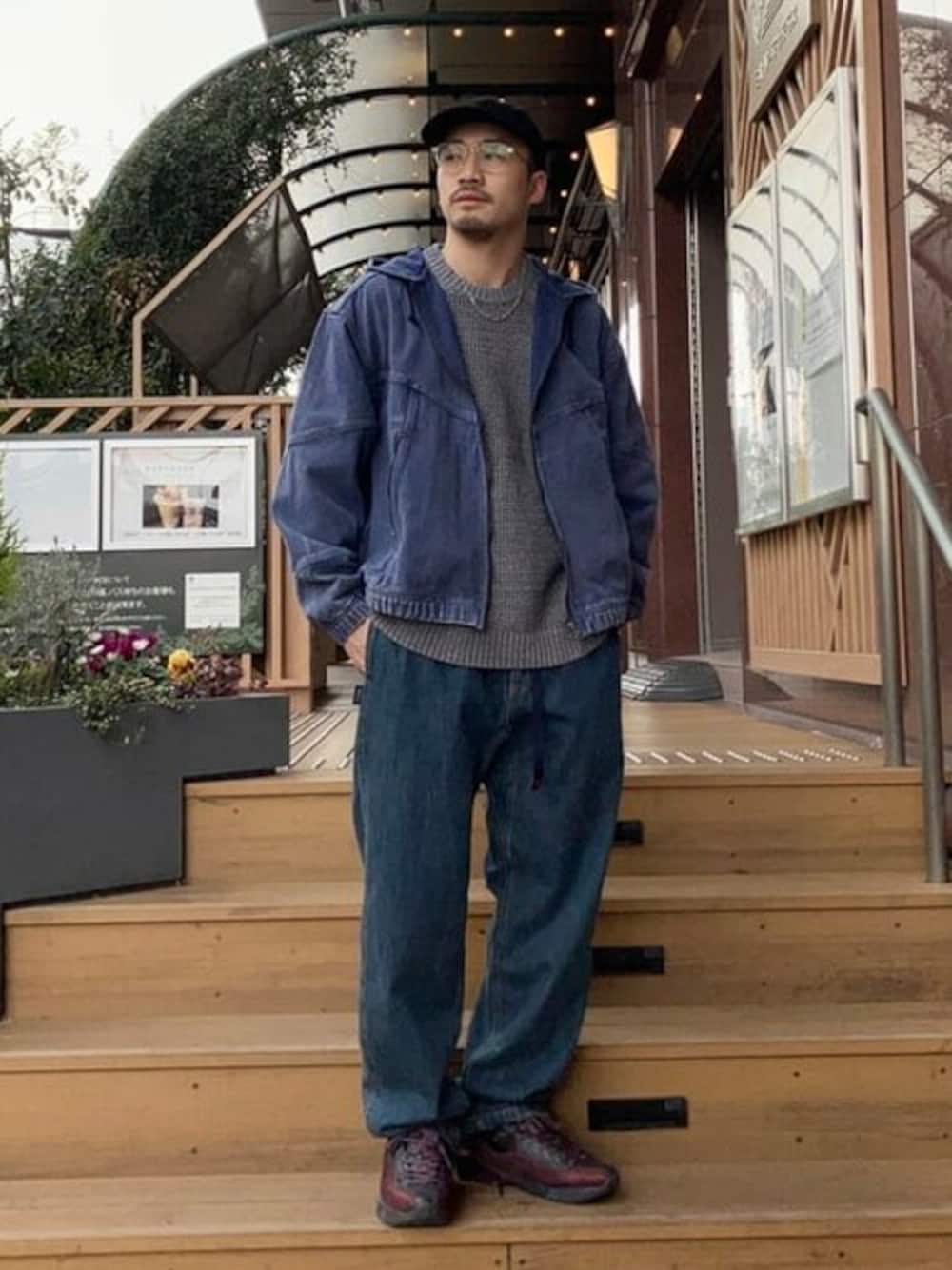 デニムとフェードブルゾンを使ったワークスタイル。抜け感のあるメッシュニットがポイントです。 BEAMS 天王寺 / 本多 武蔵