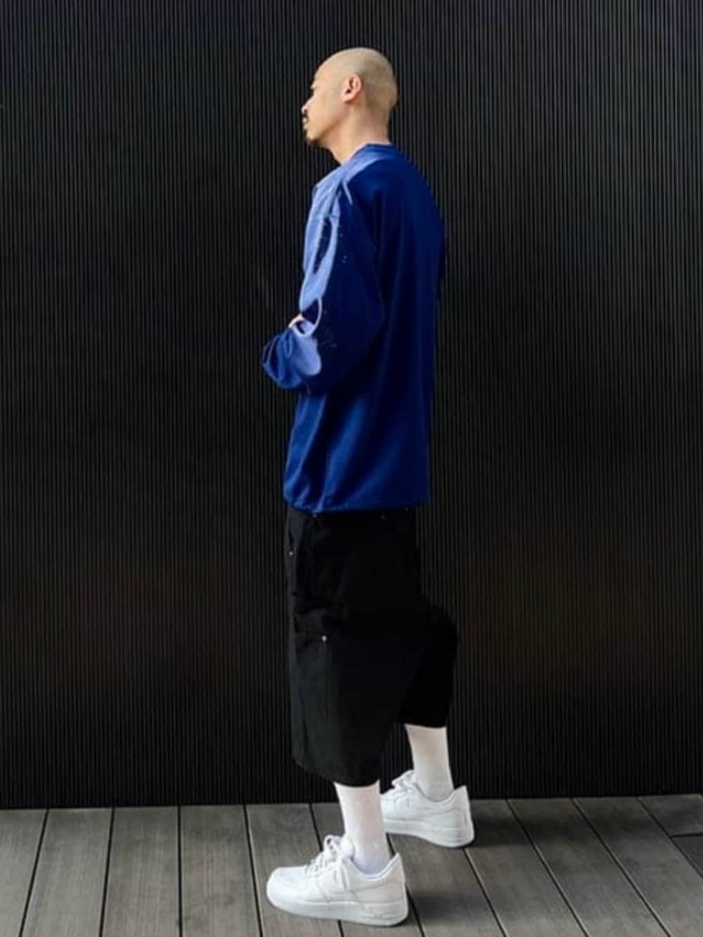 シンプルにスタイリングしました。はっきりとした色味で周囲から目を惹く1着になること間違いございません。パンツには丈が長めのショーツをチョイス。そして〈NIKE / Air Force 1 '07 WHITE〉を合わせることでよりストリートな印象を出せるようにしました。