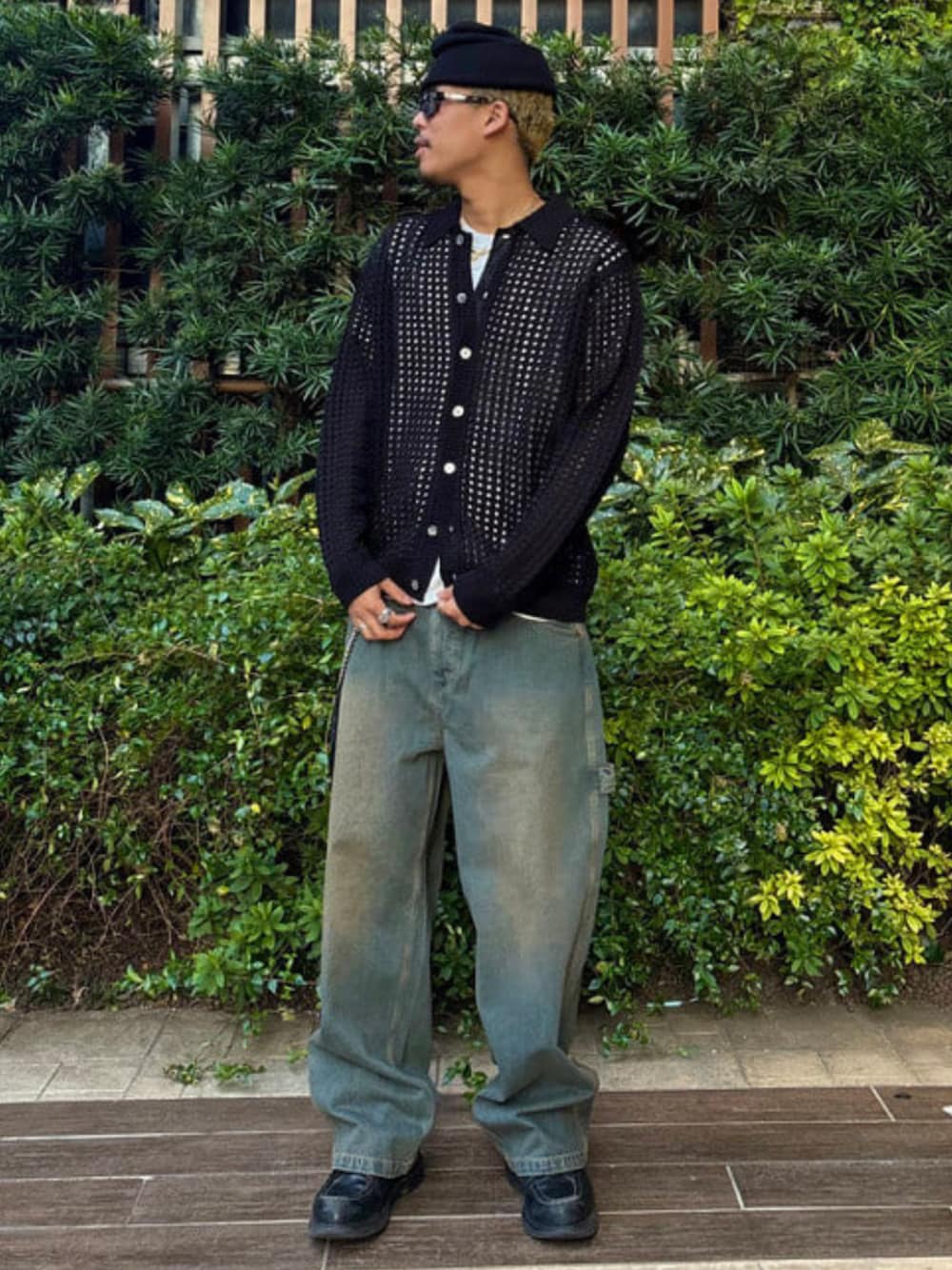 春を感じてきたのでメッシュのアイテムを着てみました。メッシュの軽さを出しすぎないように中にTシャツを着て、レザーの小物も付け足しました。パンツは腰履きしてます。春先に着たくなるコーディネート。