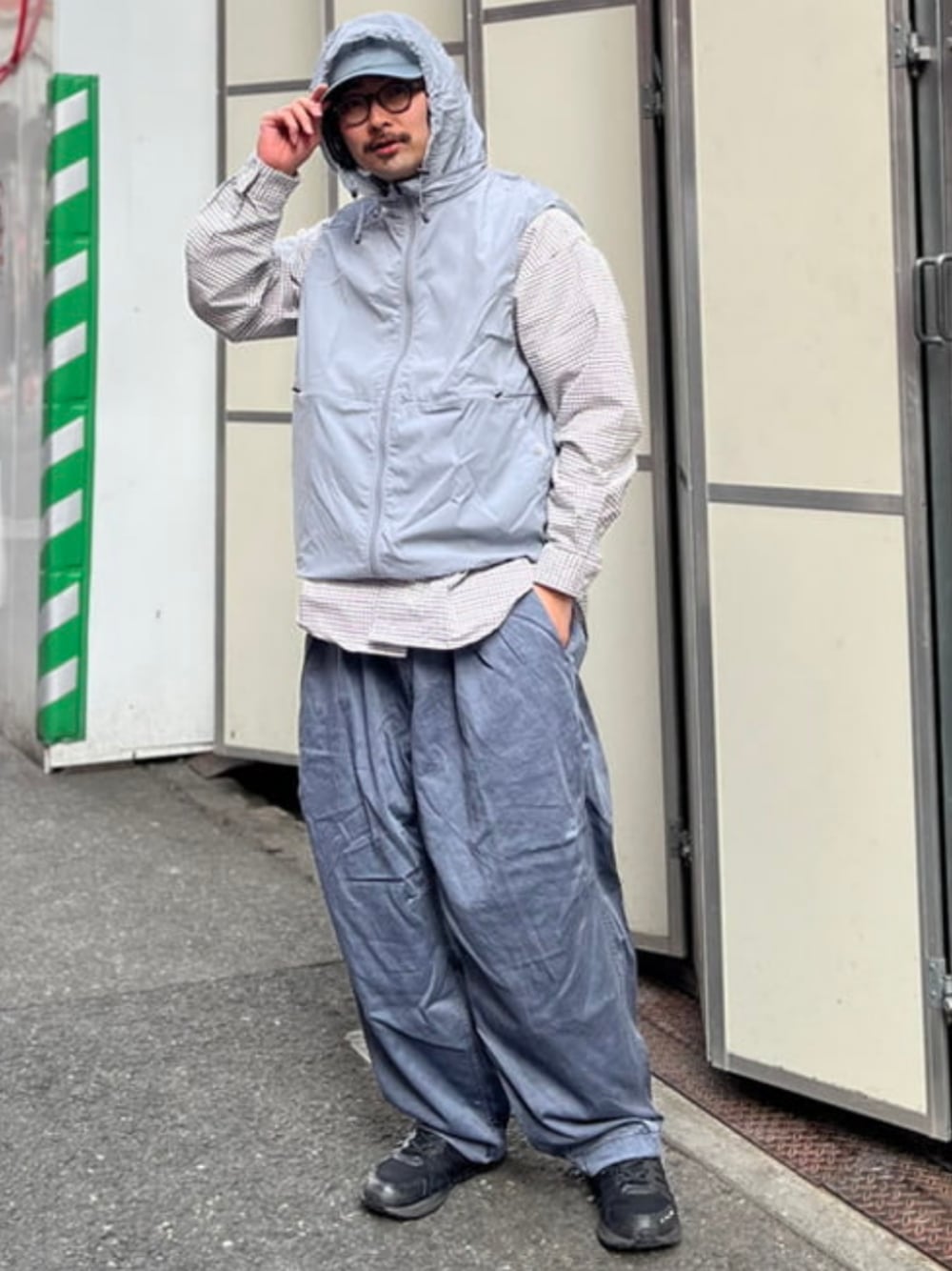 【都会的ストリートSTYLE】シルバーやフェード加工されたブルーのアイテムなどを合わせて、くすみカラーでスタイリング。控えめな合わせてですが異なる素材のアイテムをMIXさせる事でシンプルですが印象のあるスタイリングに!個人的にはベストのフードを出して被るのがオススメです!パンツはテロっとした素材感で夏場でも快適にできますよ〜!