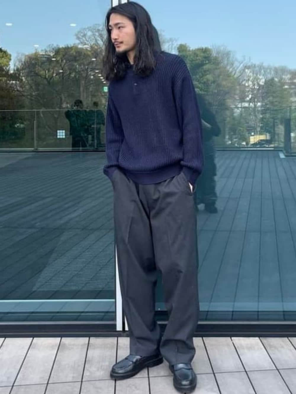久しぶりに、シンプルで無難なニットポロとスラックスの合わせを。 身長177cm, 上下Lサイズ着用。 ややゆとりのあるタイトすぎない絶妙なサイズ感かなと。