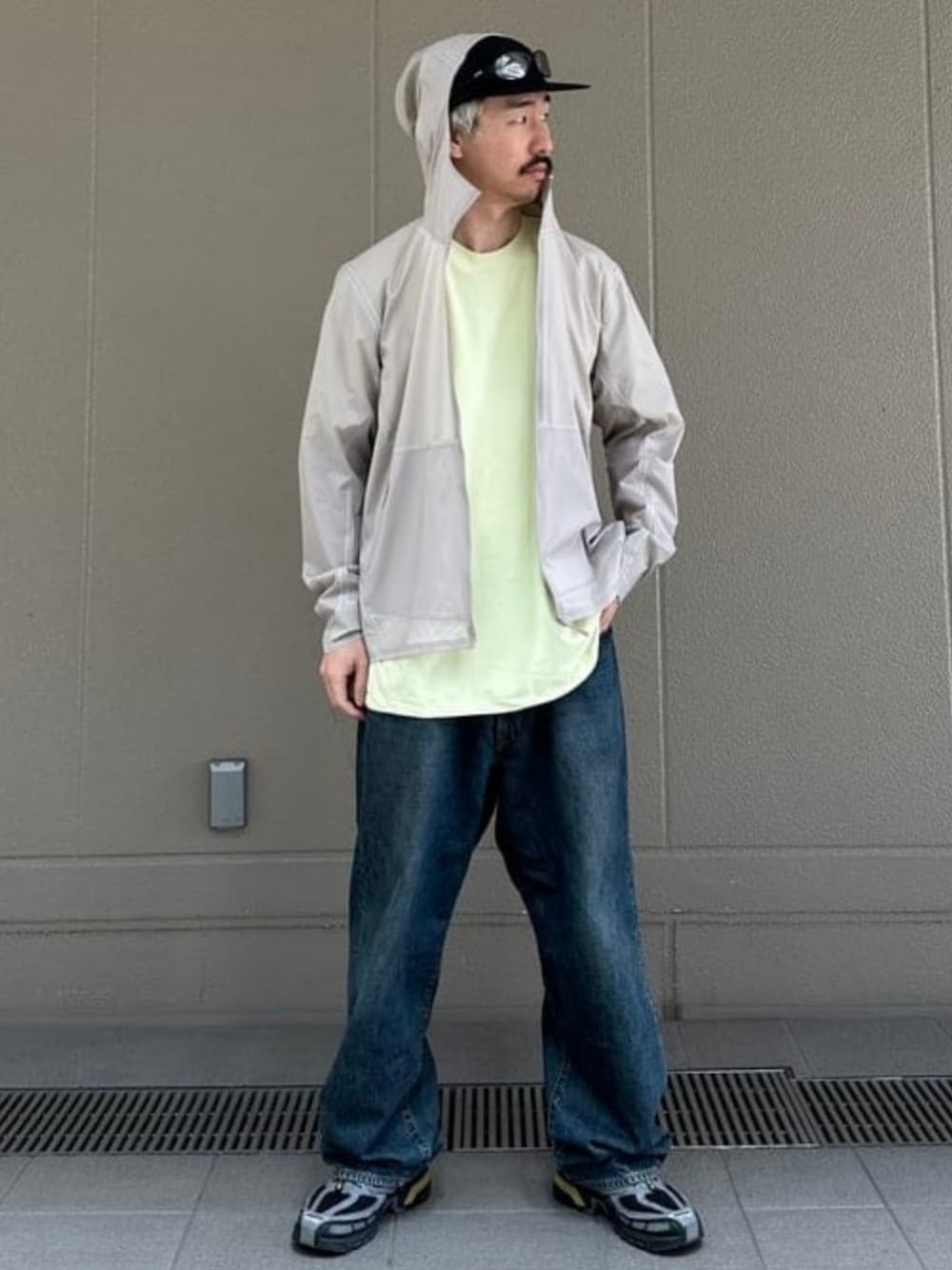 中のインナーのカラーとナイロンパーカーがポイントです。アウトドアミックスのスタイリングです! ビームス 梅田 / 秀作