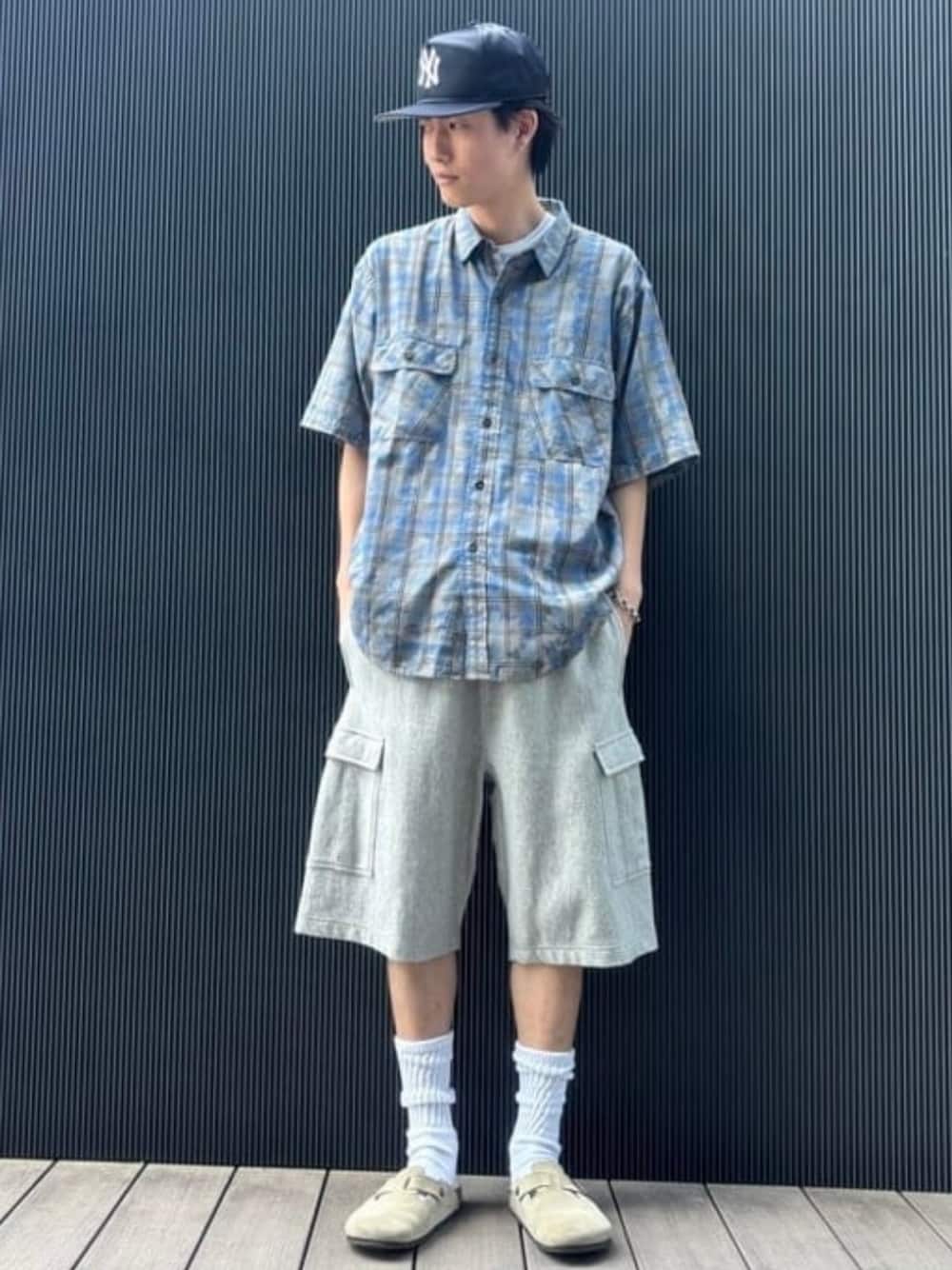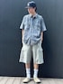 ランダムにフェード加工を施した半袖シャツをメインにスウェットショーツでラフにスタイリング。1枚で存在感のある1着です。 BEAMS / 中嶋 大介
