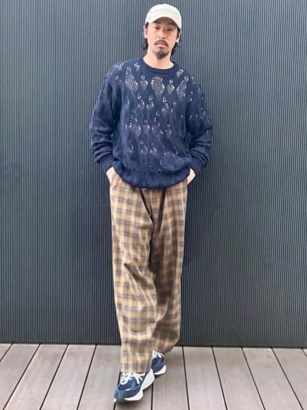 主張の強いニットとチェックパンツをベーシックに。全体の色味をバランスよく合わせた大人のアメカジコーディネート。ビームス 銀座 / 冷水 友紀