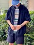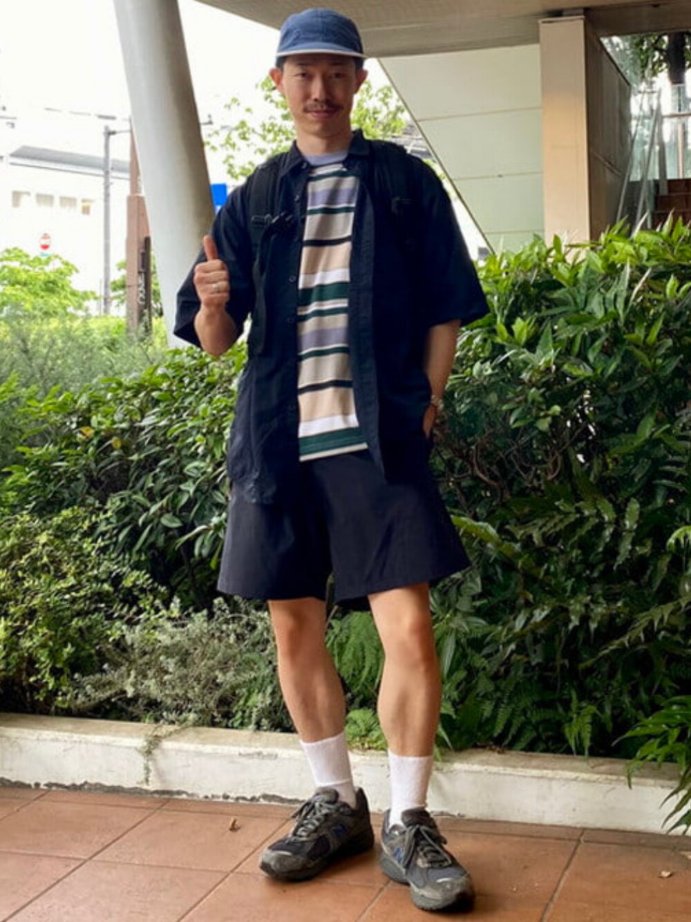 都会を軽やかに生きる大人たちへ。 テーマは「軽やかに、そして自然体で」。 ナイロン素材のセットアップは、機能性も抜群。 軽くて動きやすく、ちょっとした雨や蒸し暑さも気にせず着ることができる。 インナーには、ゆったりめのボーダーTシャツ。 少しレトロな配色が、逆に今っぽい。 肩の力を抜いたバランスが、大人の余裕を演出してくれるのさ。 仕上げに淡いブルーのキャップとロールトップのバックパックで、 街歩きにも小旅行にも対応できる万能コーデに。 “ラクなのに、手を抜いてない”って、意外とむずかしいけど、 このスタイルなら、それが自然に叶う。 166cm、54kgでシャツは大きめのMサイズ。 Tシャツとショーツは元々大きめの作りなので、Sサイズでも十分でした。ビームス 二子玉川 / じんや太郎