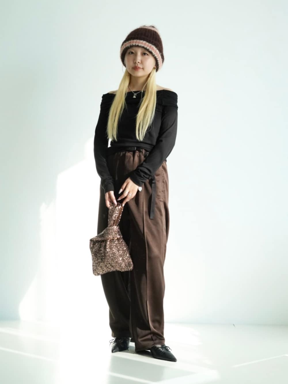 〈 GRAMICCI 〉パンツを履いてみました。メンズの展開ですが、細身でウエストも絞れるのでレディースでもSサイズなら履けます。トップスはレディライクにオフショルダーを、でもニットキャップでカジュアルに、足元はまたまたレディに。好きなバランスです