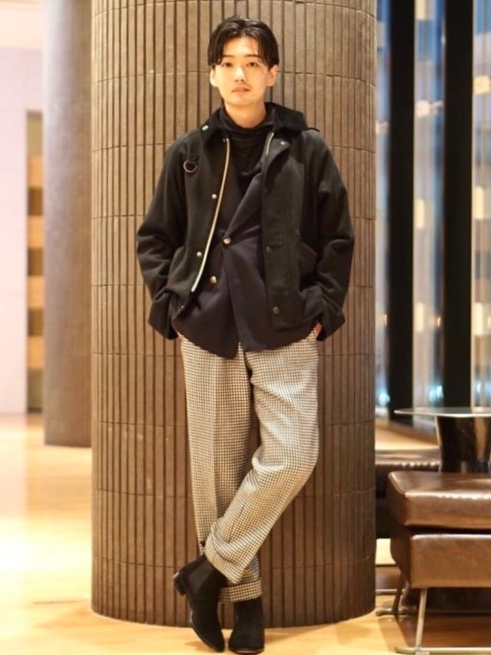 <Barbour>の『SPEY』ジャケットをブレザーにレイヤード。 トップスはダークトーンでまとめて、パンツがアクセントになっています。 ルーズなシルエットなので、サイドゴアブーツでスタイリッシュに仕上げました。