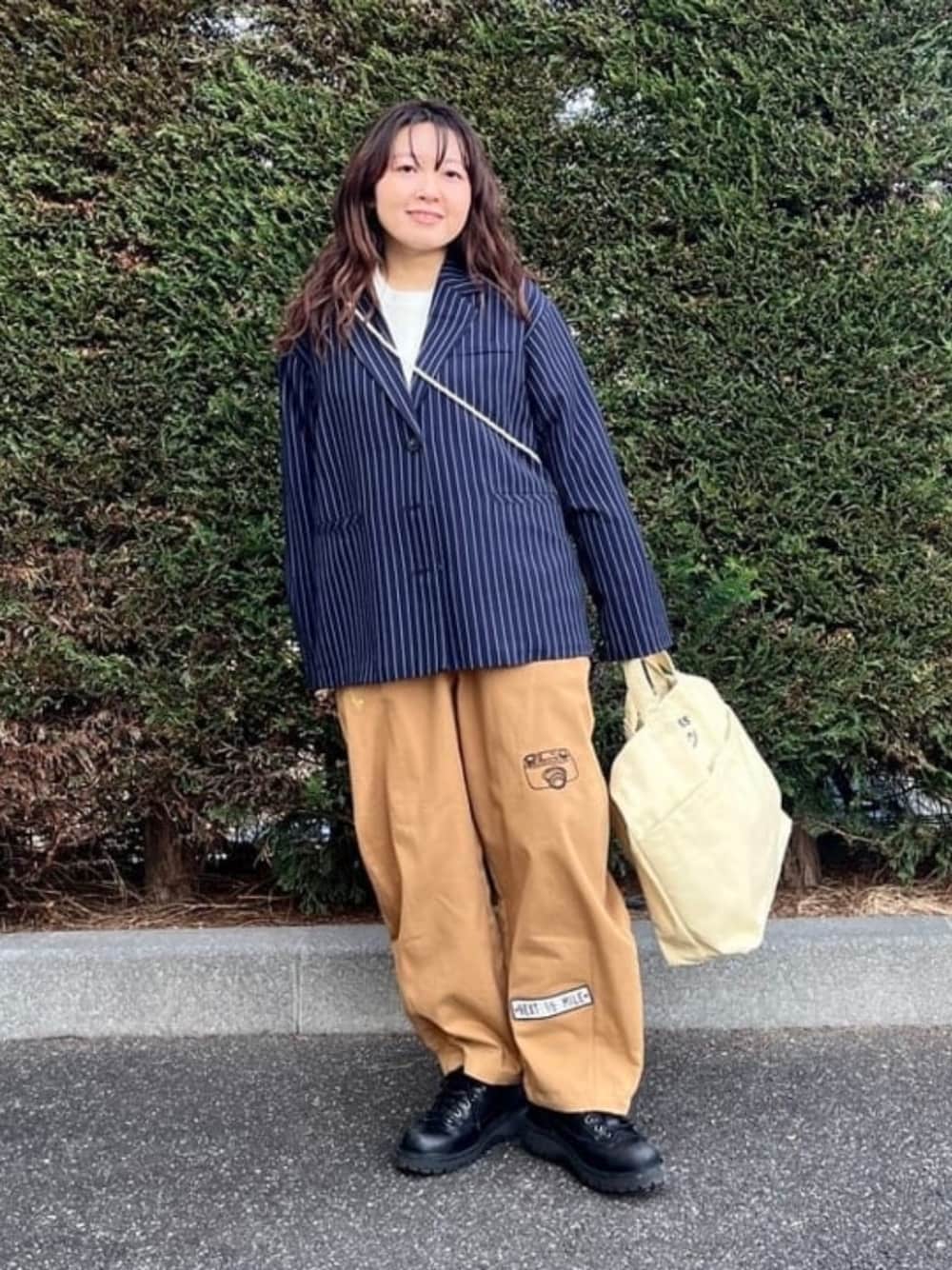 ネイビーのストライプジャケットを主役にスタイリング。インナーのニットはモチモチで着心地が抜群◎なんとこちらはリバーシブル仕様です!ボトムスにはワイドパンツを選び、リラックス感をプラスしています。刺繍とワッペンがポイントです^^足元は黒のレザーシューズで全体を引き締め、キャンバストートで抜け感を出しました☺︎かっちりしすぎず、自然体でおしゃれに見える大人カジュアルスタイルです。