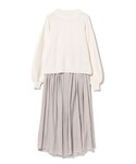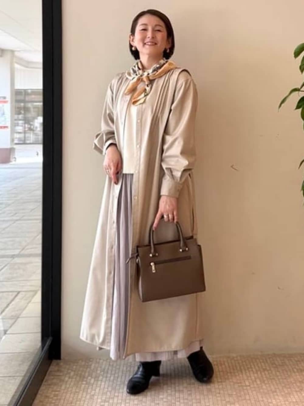 [163cm・骨格ストレート] ハイネックプルオーバー×スカートのセットアイテムを、ベルト付きタックワンピースで重ねた大人のためのレイヤードコーデ。タックワンピースは前を開けて羽織として…スカーフで視線を上に集めながら、顔周りを明るく見せています。スカートの柔らかな落ち感が女性らしさをプラスし、きれいめにもカジュアルにも対応します。通勤・お出かけ・学校行事など幅広いシーンで使える、大人女子におすすめのコーディネートです。