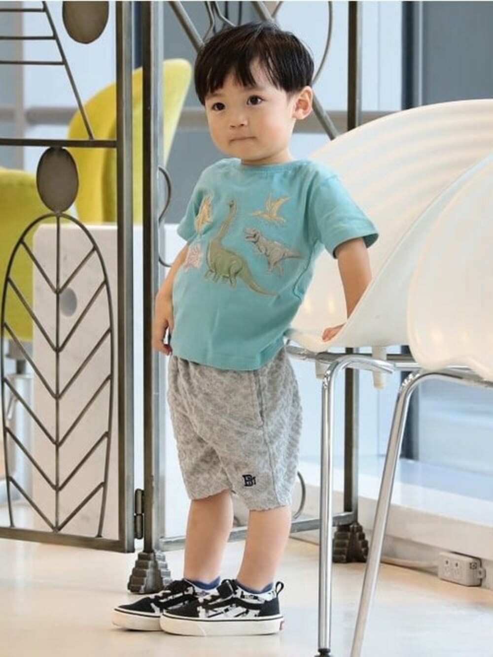 【BOY Model:85cm】グレーのショーツは淡いカラーとも相性抜群!プリントの恐竜さんたちを際立たせてくれますね♪どんなシーンにも適用できるスタイリングです。