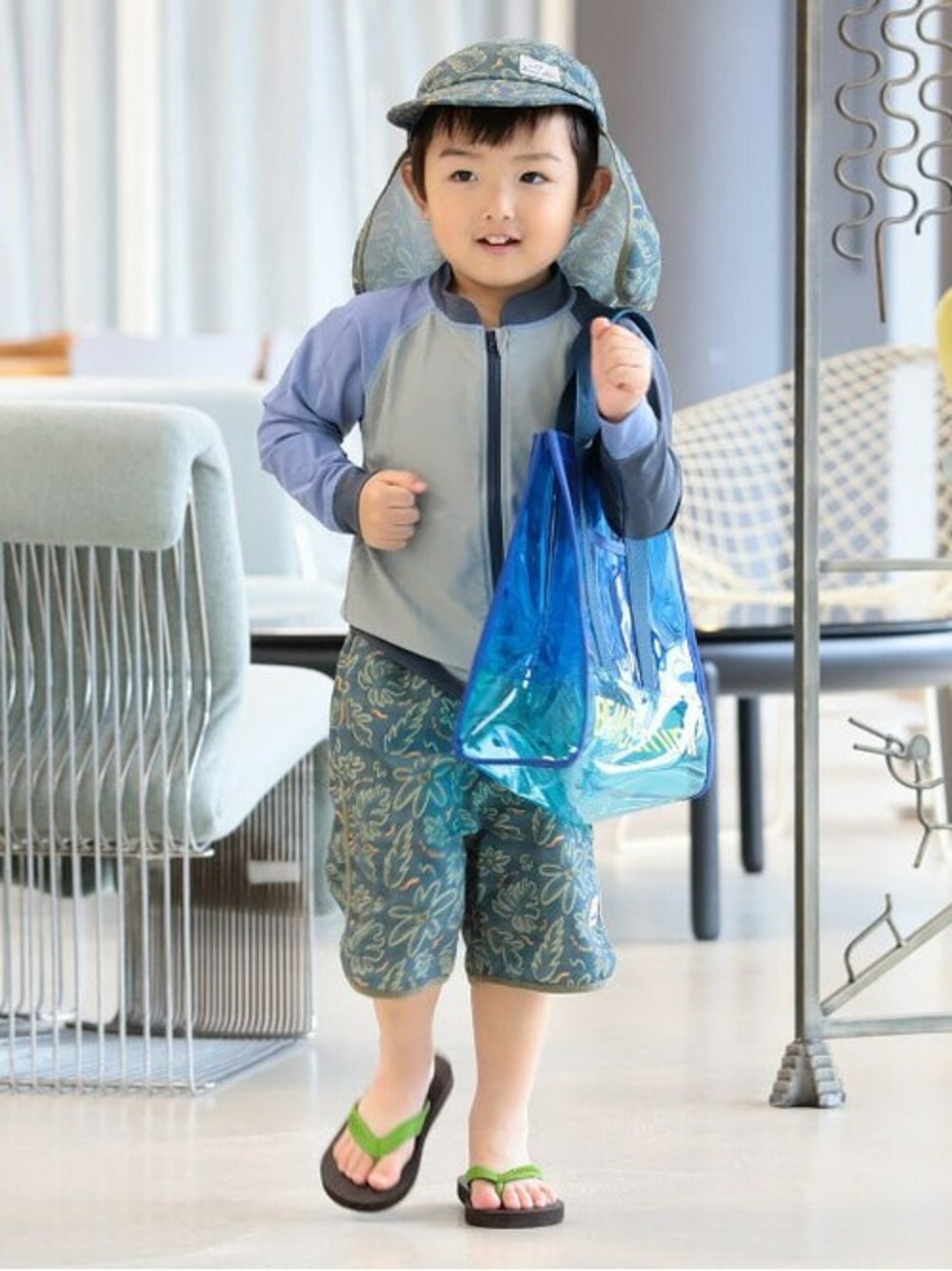 【Model:100cm】いつでも海に行けるよ!わくわくが伝わってくるような準備万端レジャースタイル♪全身をブルートーンでまとめ、統一感を出しました。