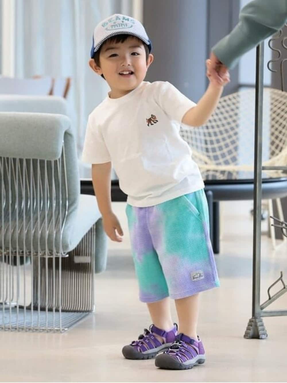 【Model:100cm】ブルー系のきれいなタイダイのショートパンツには、やっぱり白Tがよく映えます☆タイダイに使われているカラーを小物でさすのがすっきりまとまるポイントです!