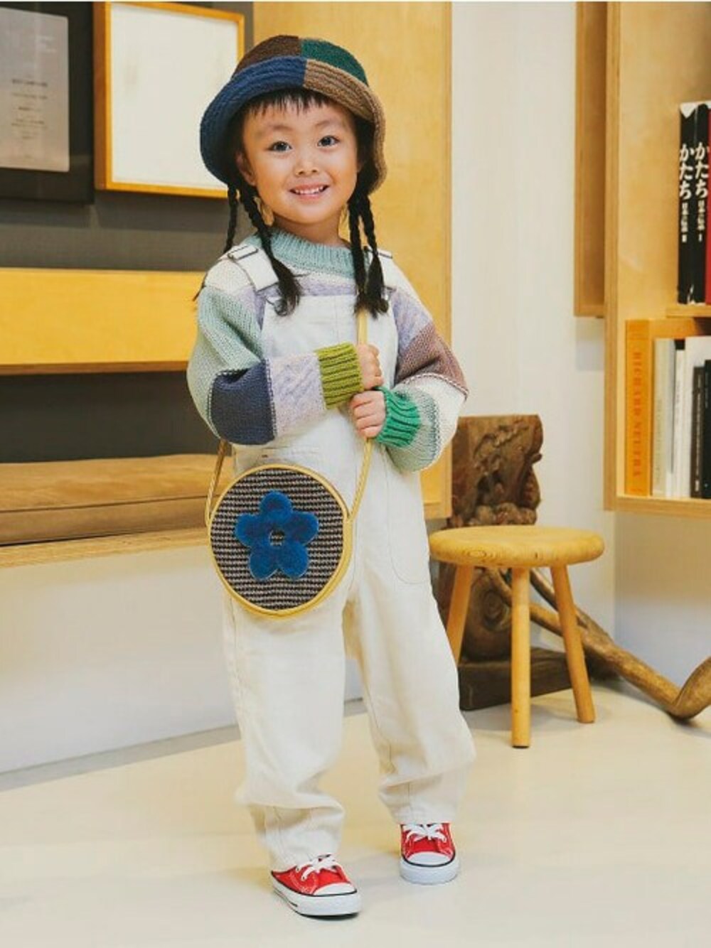 【Model:104cm】色合わせがとっても上手な4歳の女の子。ニットとハットにはクレイジーカラーを。ホワイトのオールインワンで、バランスもバッチリ。赤いオールスターを選んだところもお洒落!