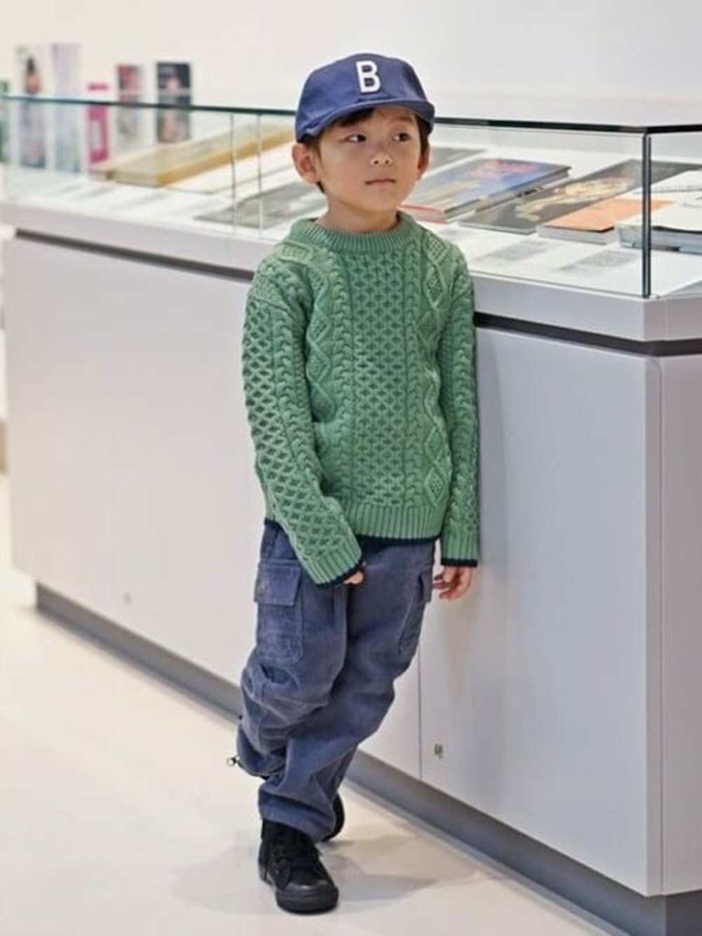 【Model:110cm】グリーン×ブルーのきれいな色合わせ。キャップにもブルーを差して、統一感のある仕上がりに。ケーブルニットで鮮やかなカラーはとっても新鮮ですね♪