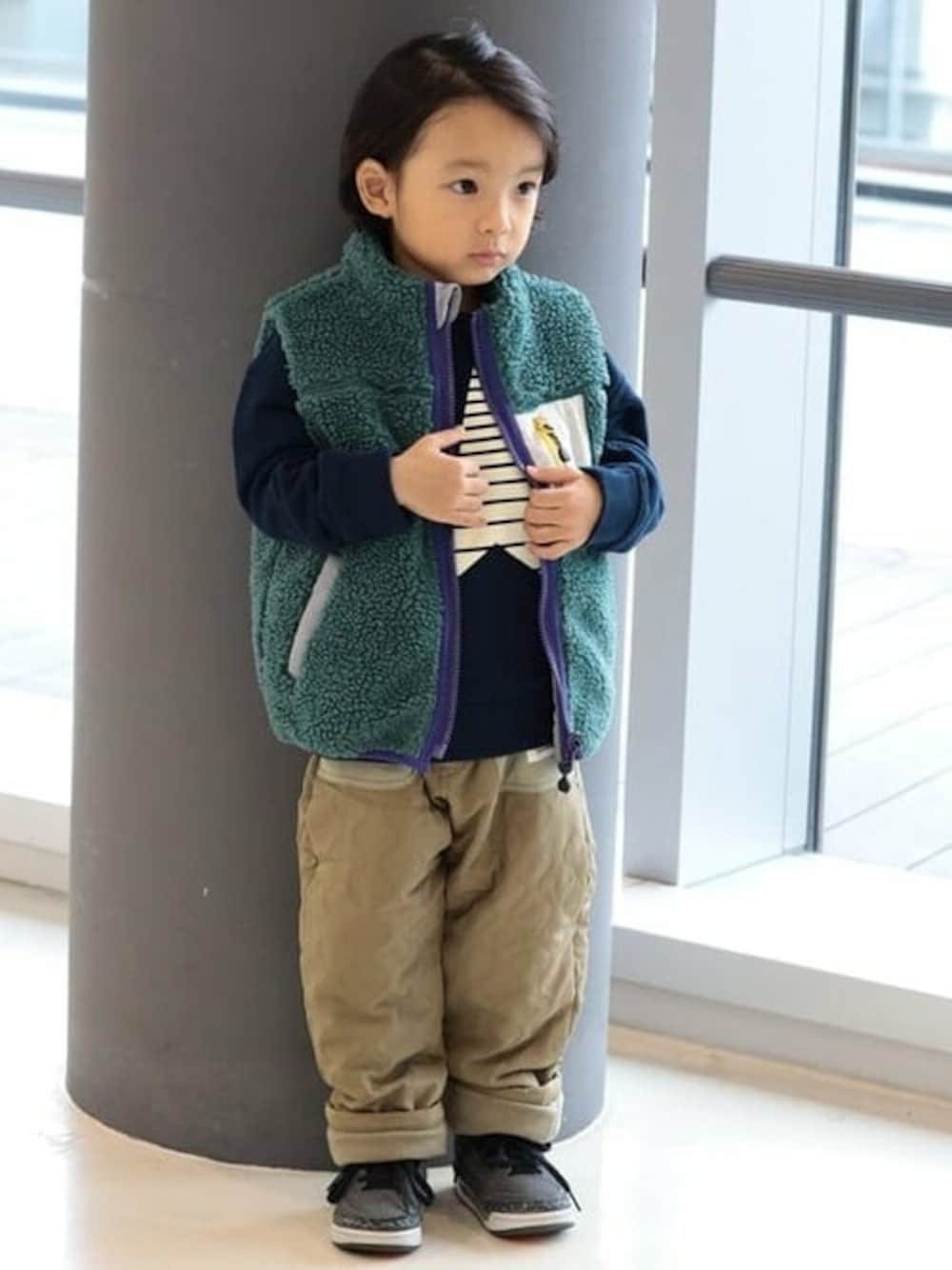 【Model:100cm】4歳年少さんの男の子。ベストからのぞく大きな星が印象的なスタイリング☆大人が寒さで震える中、子どもはケロッとしていることも多いですよね。活発に動くお子さまは、体温調整に便利なベストで体幹を温めるのがオススメ。身長100cmですべて110サイズをセレクト。パンツの裾は少し長いけれど、ロールアップしてニュアンスを出すのもいいですね♪