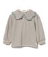 【Model:107cm】6歳、年長さんの女の子。大きな襟のカットソーを生かして、ノーカラーコートのアクセントに。コンパクトなスカートにタックインスタイルですっきりと。ベレーでおしゃまに仕上げました♪