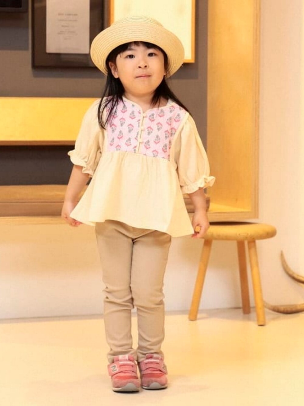 【Model:93cm 100cm着用】もうすぐ4歳の女の子。ふんわりと広がるAラインシルエットが可愛らしいチュニックは、胸元のピンクの小花柄がポイント!ベージュ系のパンツと合わせて、春らしいナチュラルコーディネートでお出かけが叶います。