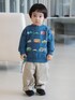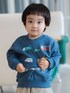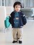 【Model:H84(cm)】大好きな働くくるまのスウェットを着てごきげん♪な2歳男の子。肌寒い時期に活躍するスタジャンを羽織ればちょっぴりクラシカルなアクティブスタイルの完成です!