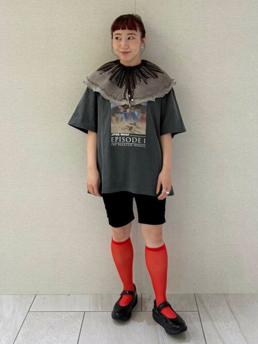 【夏のTシャツスタイル】ピチTばかり集めていた私ですが、オーバーサイズに挑戦したいと思いメンズのMサイズで着用してみました☺︎シンプルになりがちなTシャツスタイルはつけ襟やソックスなどの小物を使って派手に仕上げるのが今の気分です♩©︎& M Lucasfilm Ltd. BEAMS 立川 / niwano