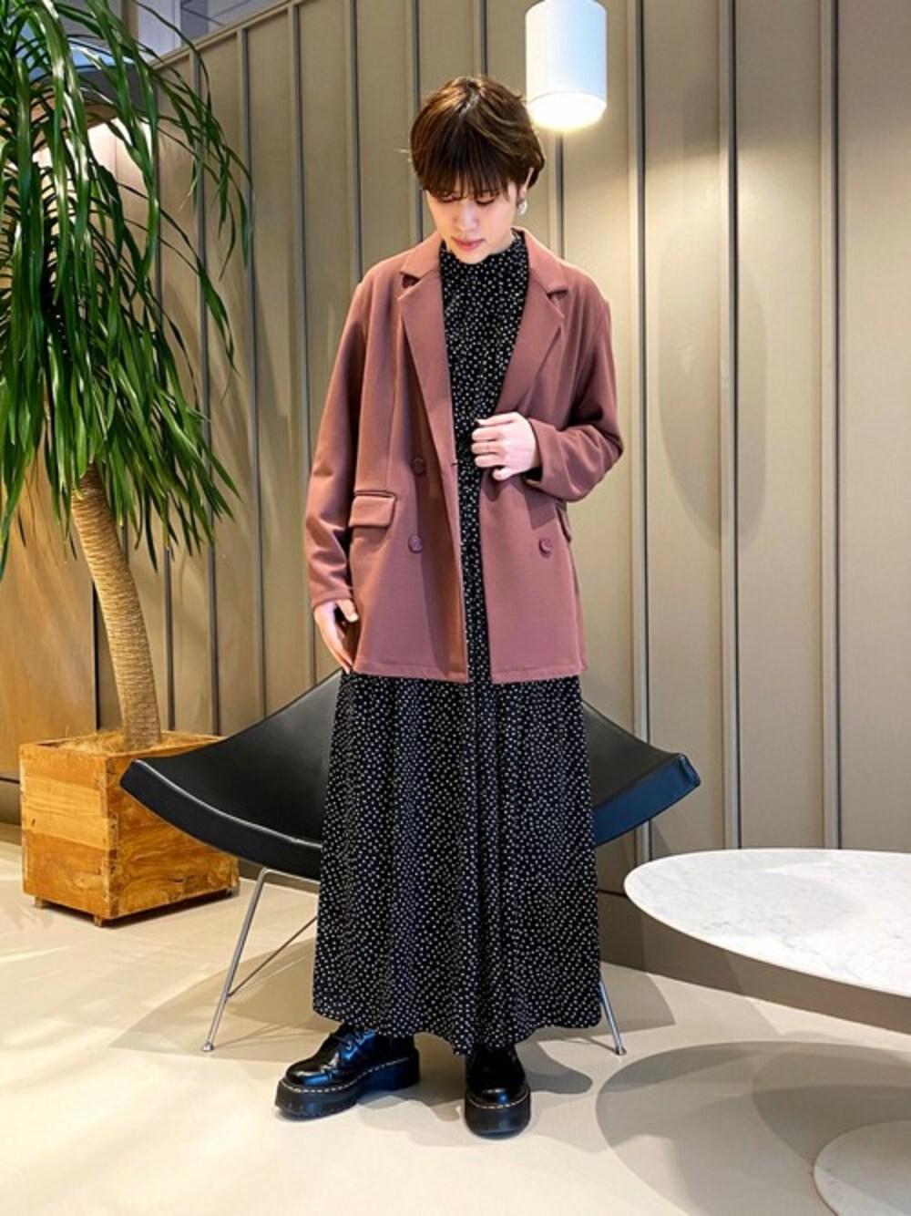ドットのワンピースにピンクのジャケットをポイントにしたスタイリングです! ストレッチの効いたジャケットは程よく抜け感が出て着やすいです♡