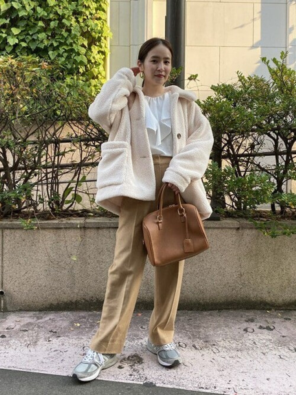 こんにちは! ボアのコートを大人っぽく仕上げました。 子どもっぽく見えないのはベージュトーンで統一しているから。 かっちりバッグもリッチ見えしてくれるのでオススメです!