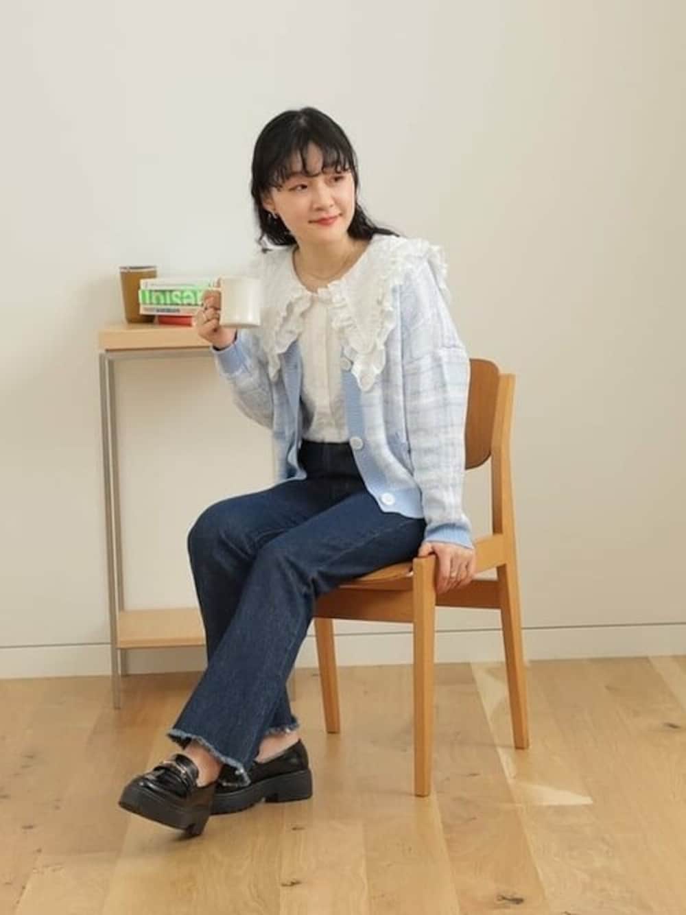 こんにちは! 【おうちでまったり】最近の休日はもっぱら家で映画三昧。そんな日が続いてもおしゃれはしたい〜。シワが気にならないこの優秀なブラウスとざっくり羽織れるカーディガン!急に友達を呼んでもOK〜〜!