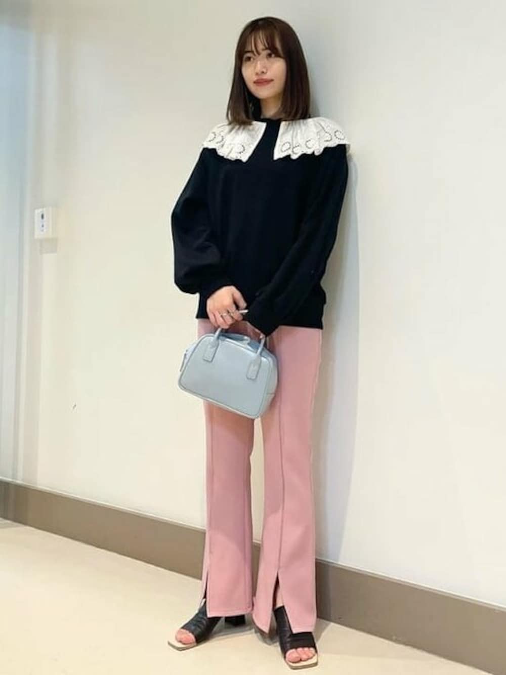 レース襟(しかもギャザー入)プルオーバーがフェミニンで可愛らしい一枚。プルオーバーはBLACKなので甘くなりすぎない雰囲気が気に入っています。敢えてピンクの美シルエットパンツで合わせて大人っぽく、敢えてパステル合わせでブルーのミニボストン。雰囲気軽やかに!◎ ビームス ウィメン 原宿 / 菅野 梓
