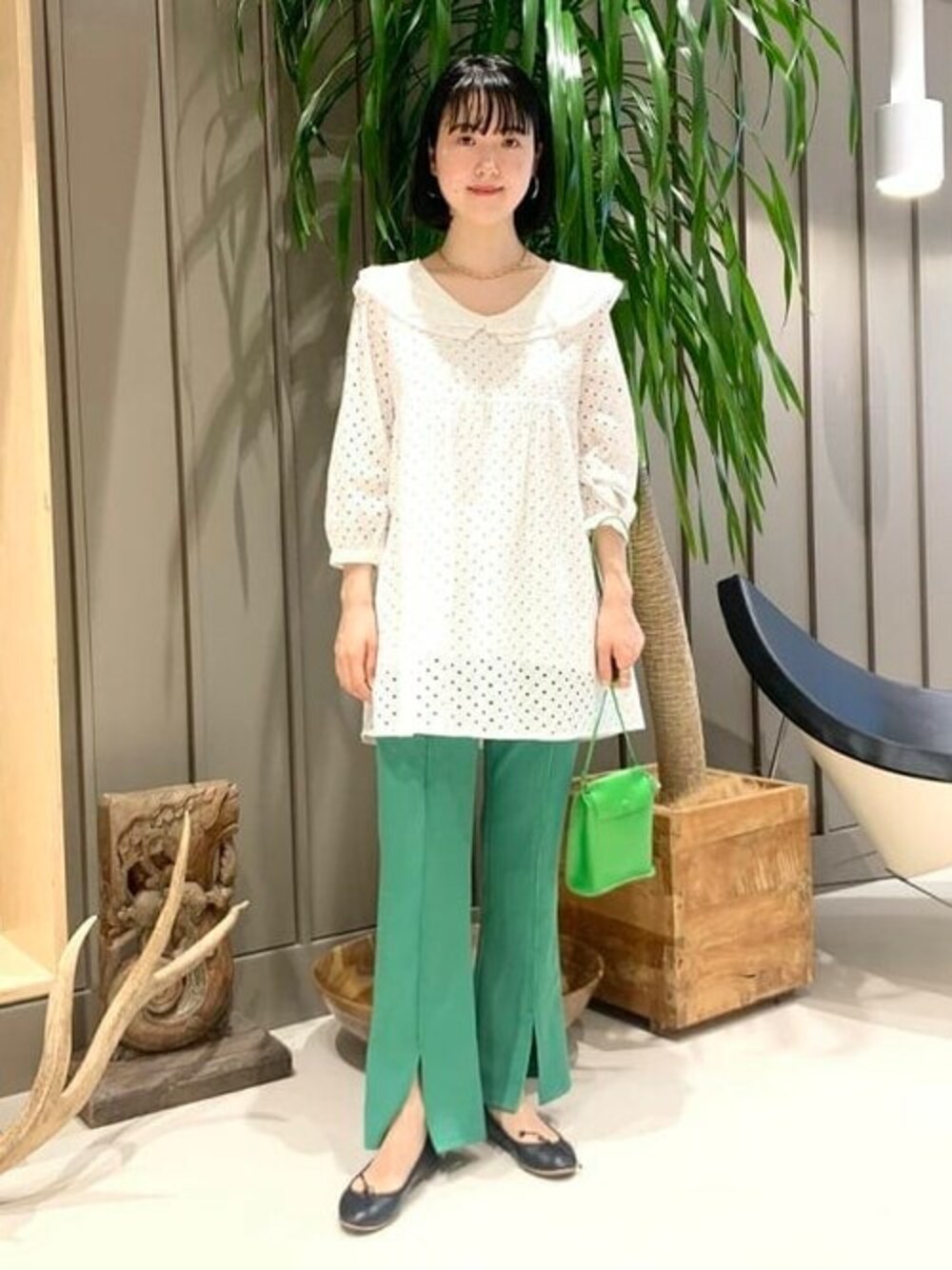 フリルとドットがラブリーな印象のブラウスですが、胸元がスッキリとしているので甘すぎずに着用できます。カラーパンツは前裾にスリットが入っており、履き心地もバツグンです! ビームス 六本木ヒルズ / kanoko