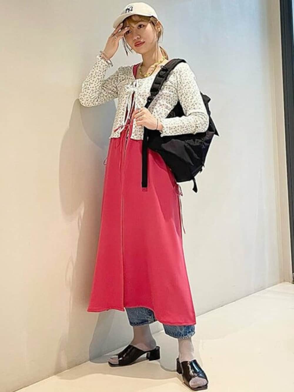 【セットアイテムを上手に♡】レーベルミックスで着用したお出かけにピッタリなコーデ◎サーモンよりのピンクとデニムの組み合わせがめちゃかわですし、サイドスリットによるチラ見えもかわいい〜!サーマルのキャミとカーデの間に取り入れましたっ ビームス ウィメン 原宿 / 菅野 梓