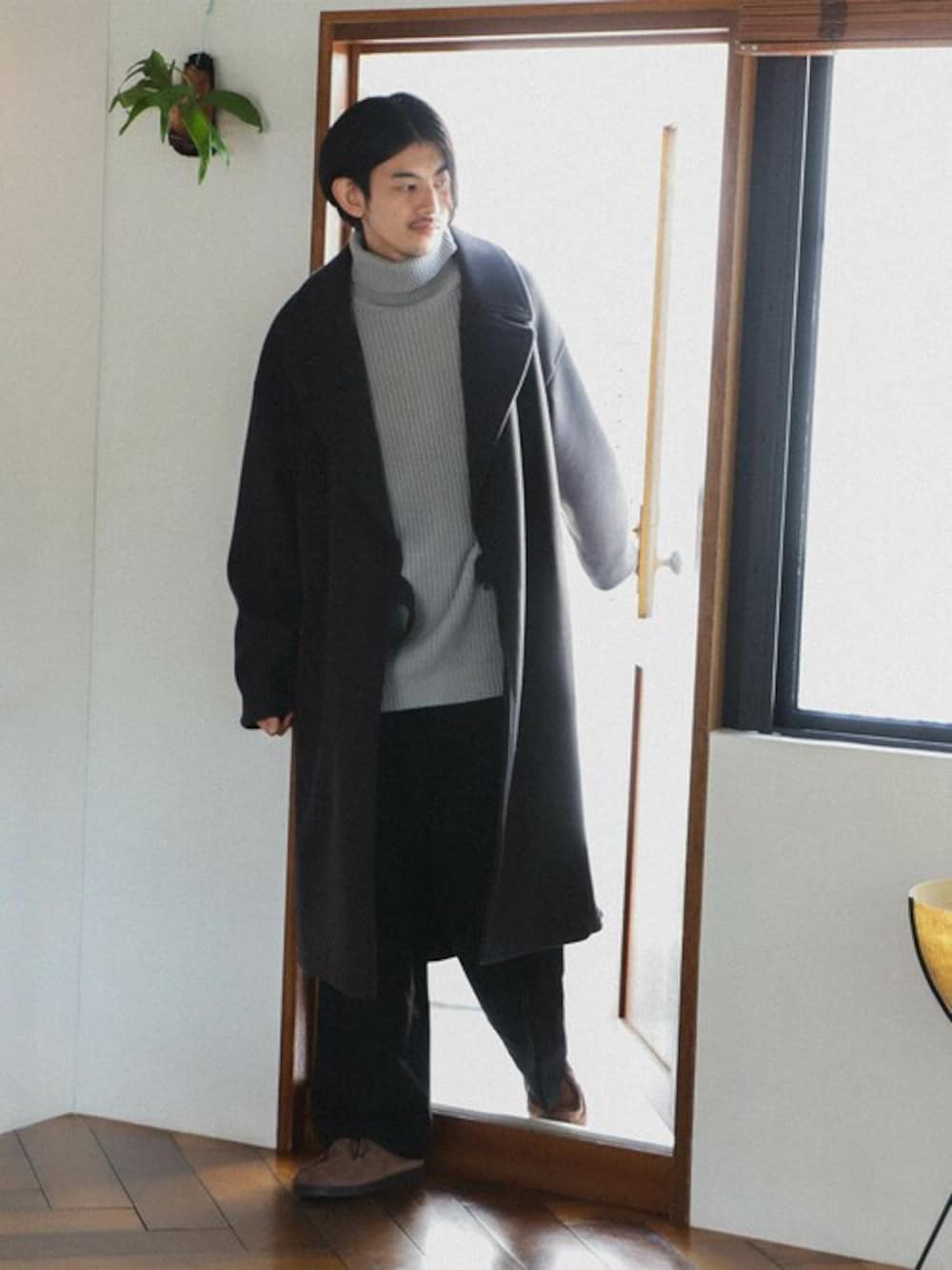 ロング丈のコートをメインに、モノトーンでコーディネート。 コートにタートルネックのニットは相性抜群です。 BeAMS DOT / Naoki Syuzui